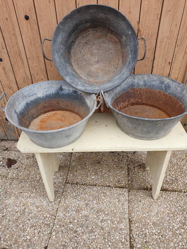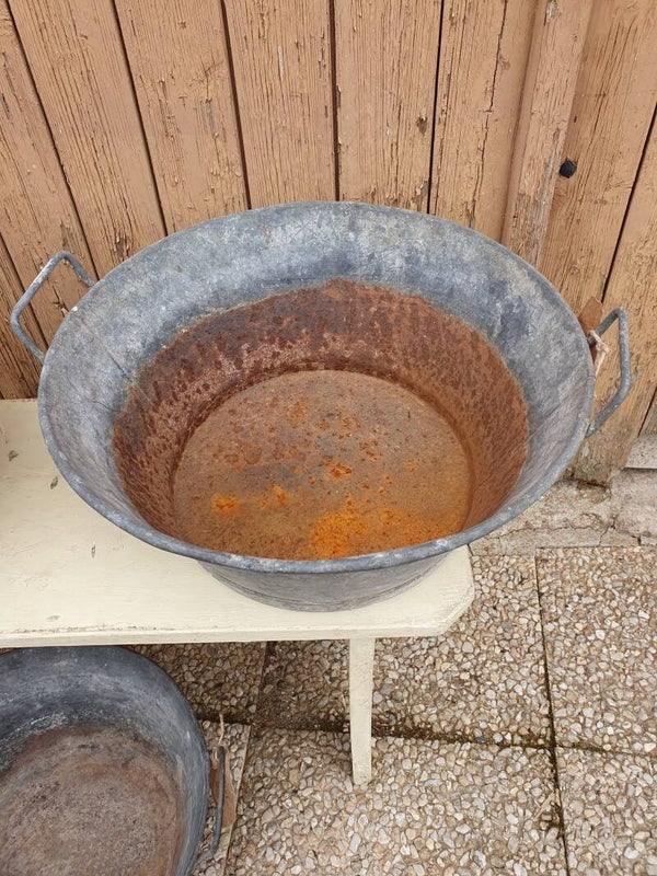 Vintage zinken bak met 2 handgrepen van 17 cm hoog en met een diameter van 39 cm.