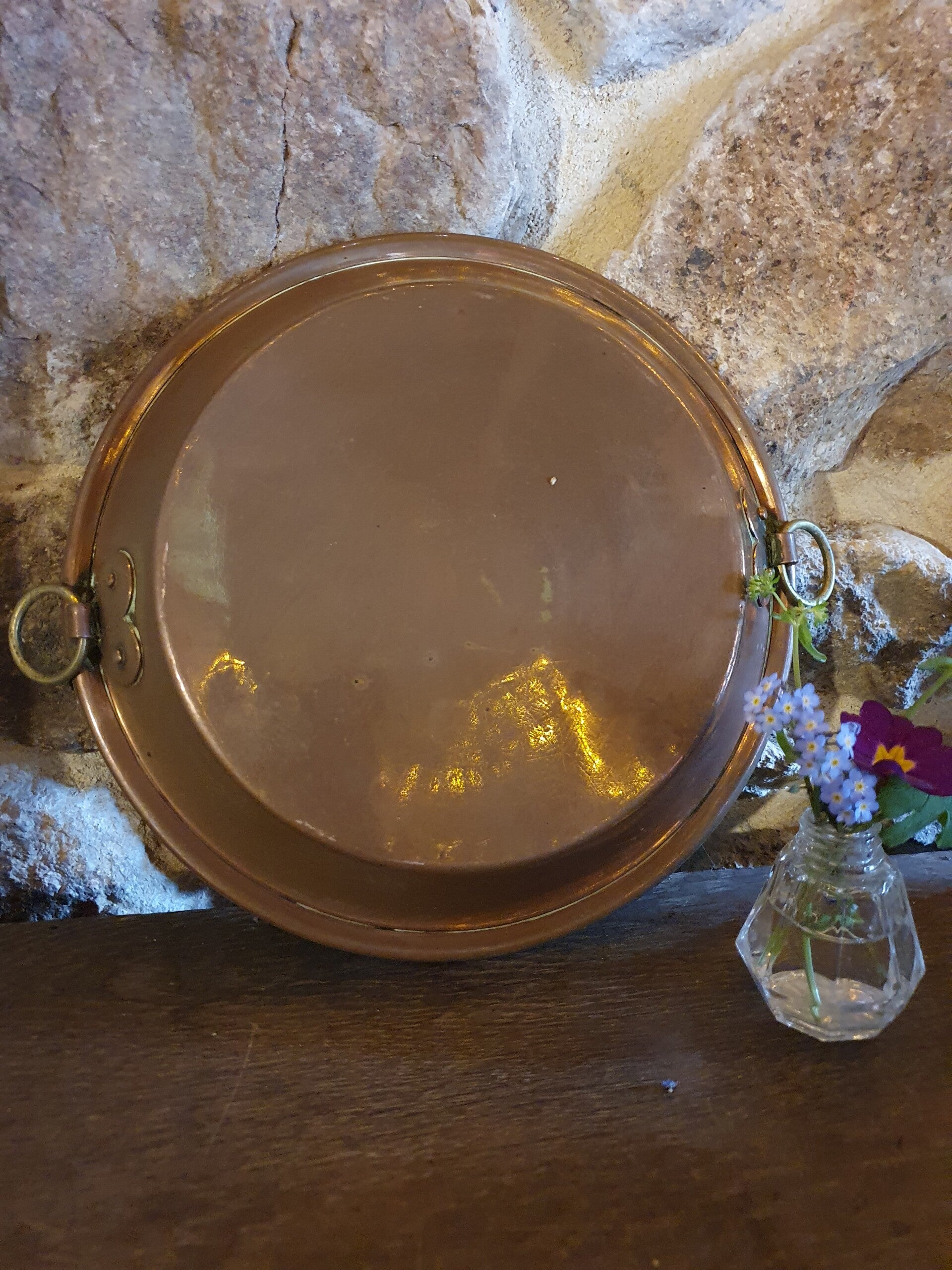 Bol bas en cuivre rouge avec anneaux en laiton. Beau comme bol de fruits. Le bol mesure 25 cm de diamètre et 4,5 cm de haut.