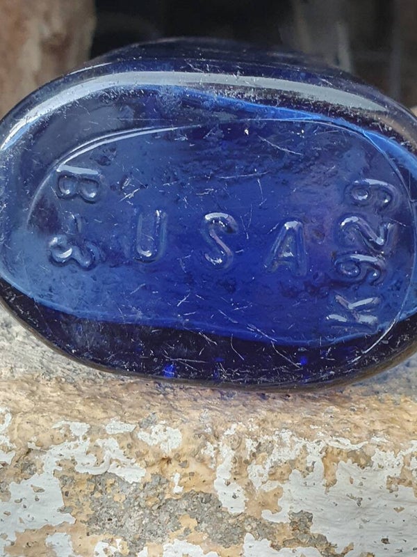 Bouteille ovale bleu cobalt américaine spéciale "Magnesium Milk" de 1923-1939 de l'usine chimique Philips de Glenbrook, Connecticut USA. La bouteille mesure 17,5 cm de haut.