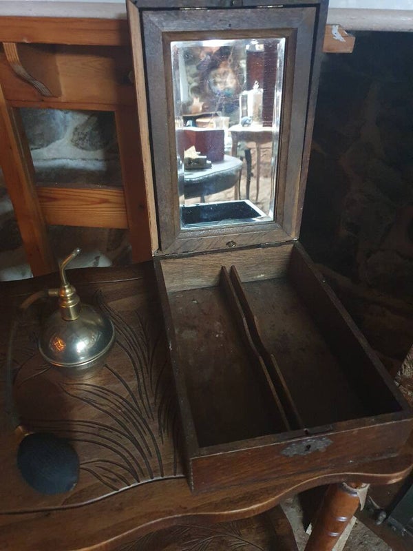Leuke brocante scheerspiegel in een houten kistje met vak verdeling. In het smalle vak in het midden hoort het scheermes.