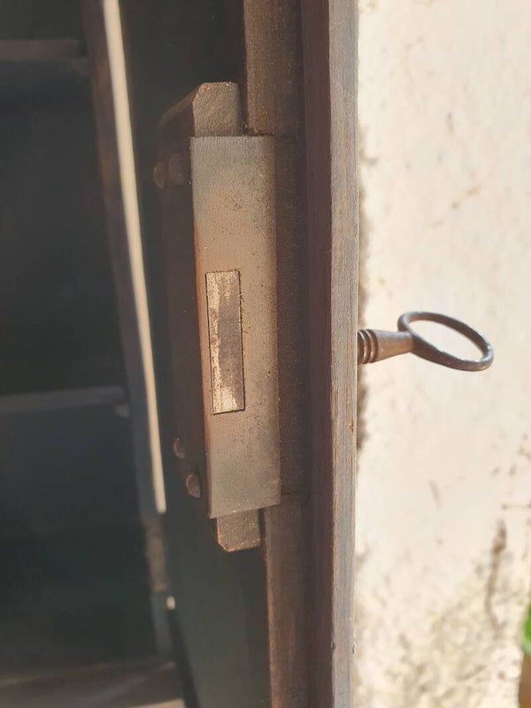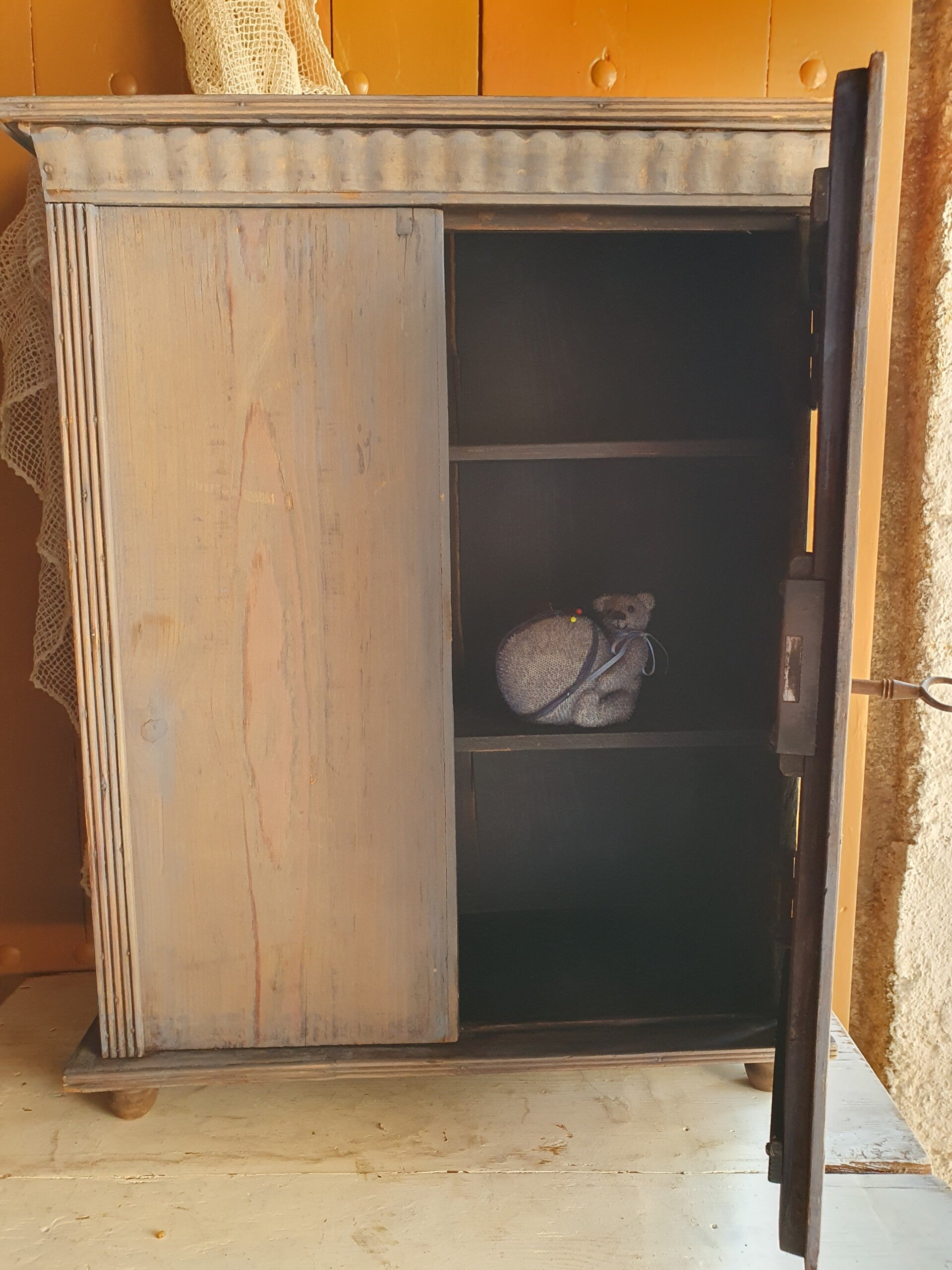 Très joli meuble ancien de brocante bleu avec 2 portes, 2 étagères. Vous pouvez sécuriser la porte de gauche avec 2 curseurs et la porte de droite avec une clé. L'armoire a plusieurs jolis détails, comme on peut le voir sur les photos. L'armoire mesure 56 cm de haut x 44,5 cm de large x 21 cm de profondeur.