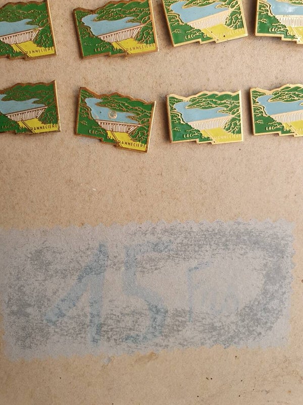 Pin's vintage du Lac de Pannecière. J'ai trouvé un vieux présentoir en carton avec des épingles du lac de Pannecière. On peut encore vaguement lire l'ancien prix de 15 francs !