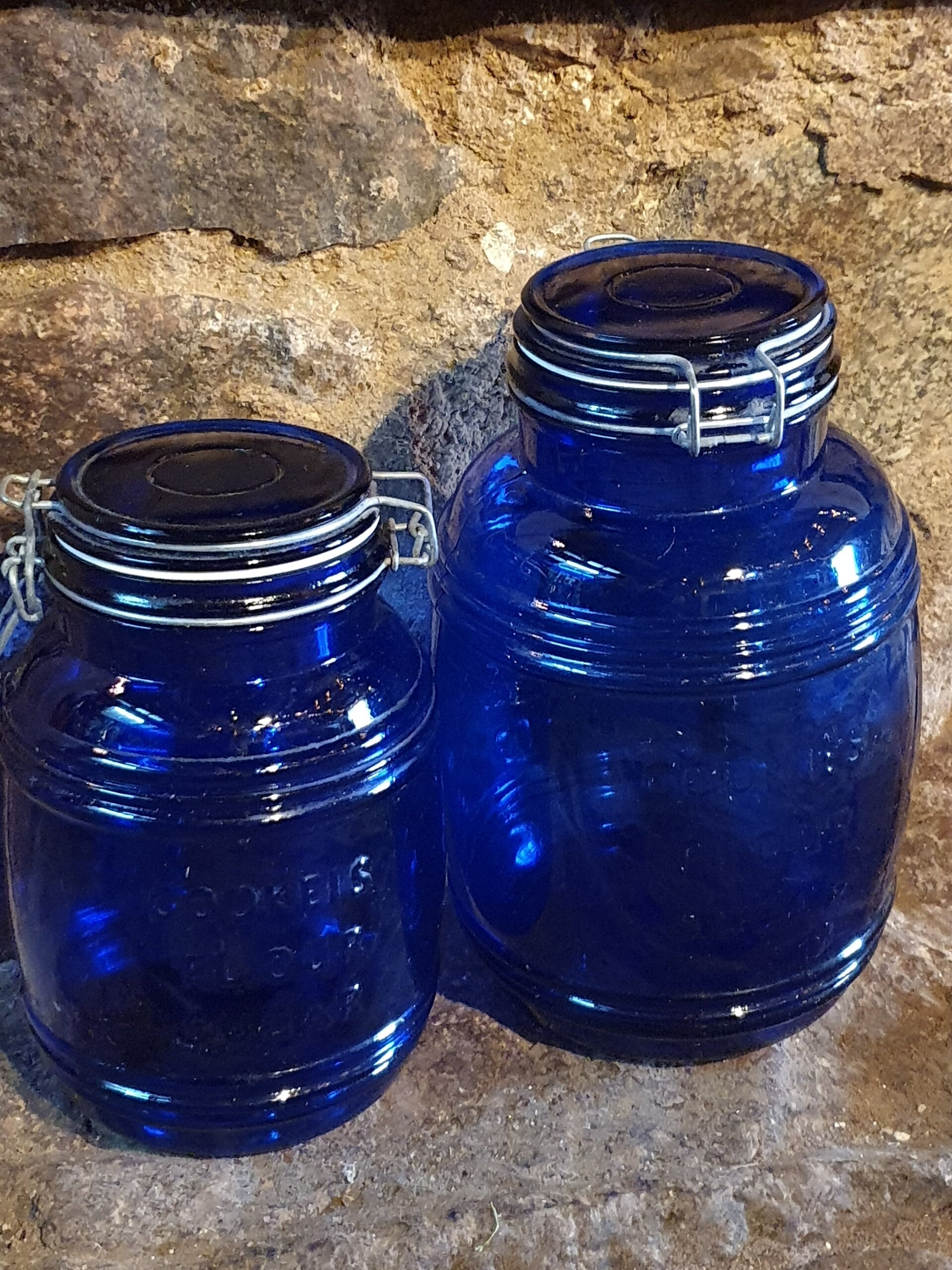 Mooie voorraadpot in kobaltblauw glas met op de ene kant de tekst: Cookies, flour, sugar en op de andere kant: cracker barrel style, full value en always fresh. Maat 1 1/2 squarts.