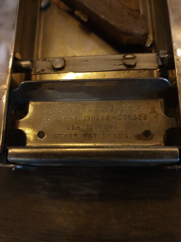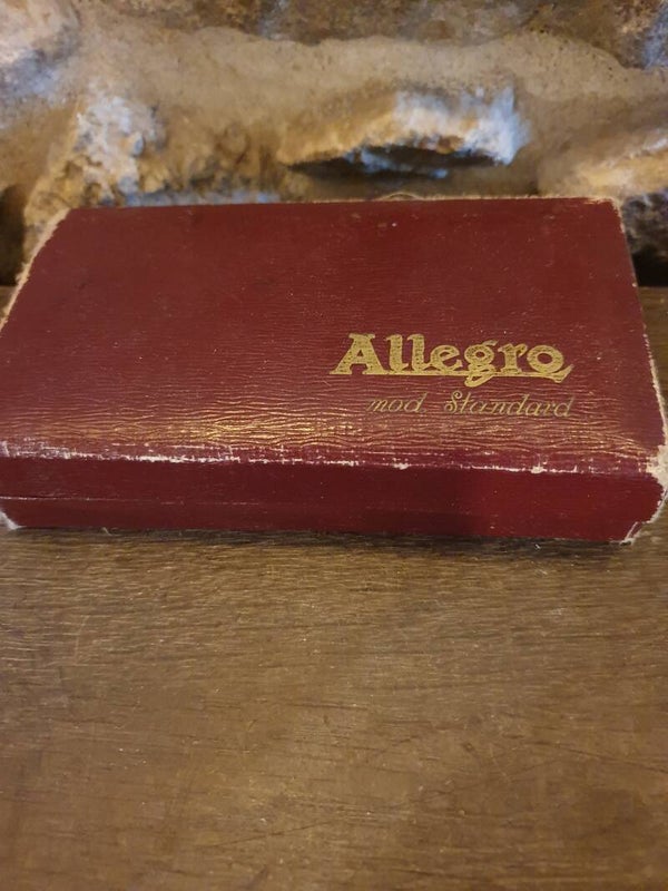 Antiek kapper / barbier scheermes slijp- en aanzetsysteem van Allegro in originele doos met gebruiksaanwijzingen in 9 talen. Het is gemaakt in Zwitserland, ca. 1950. Hiermee konden scheermessen weer scherp gemaakt worden.