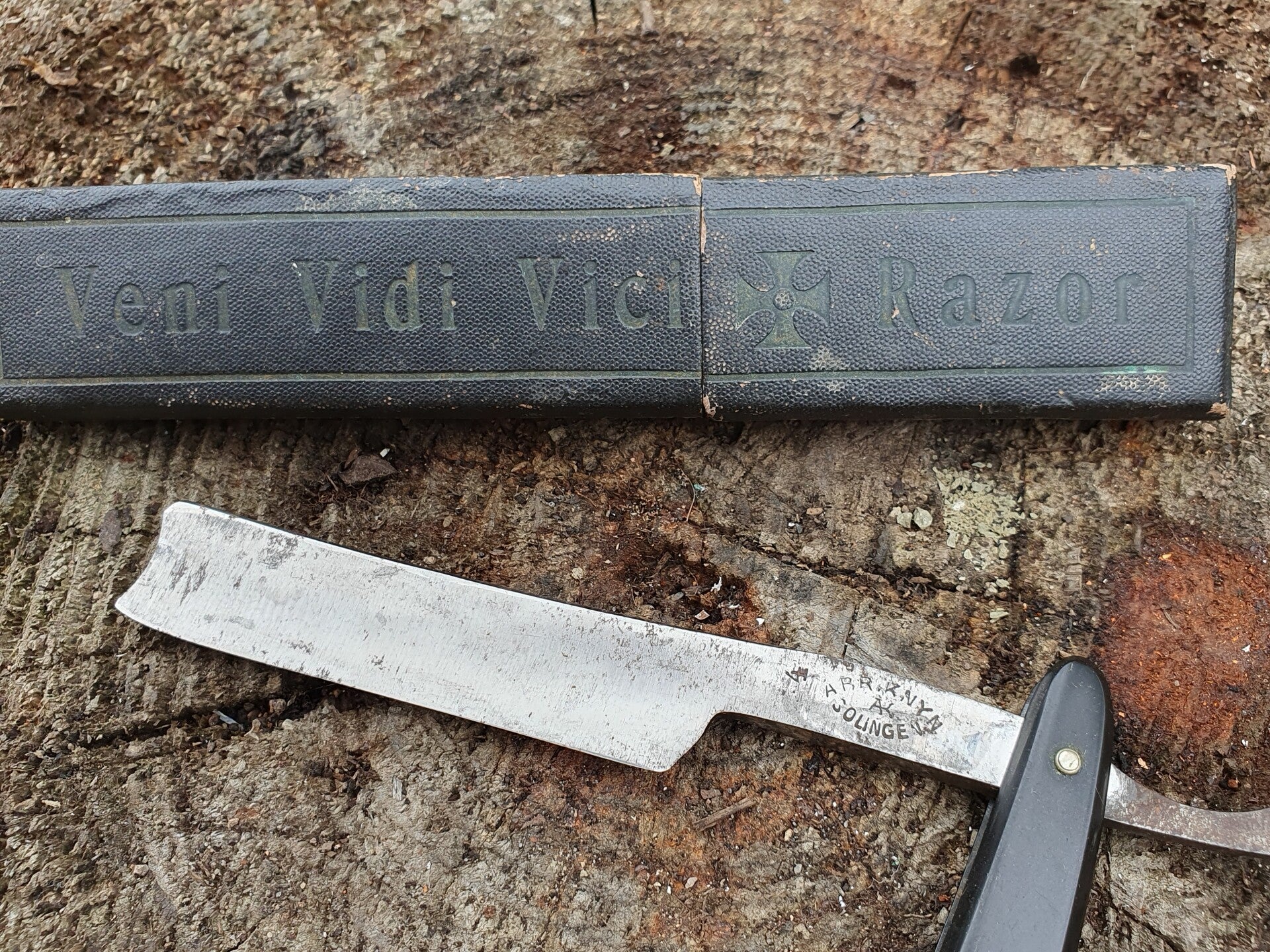 Accessoire de coiffeur/barbier ancien : rasoir n° 4 d'Abr. Knyn, Solingen. Rasoir "Veni Vidi Vici" (je suis venu, j'ai vu que j'ai gagné) avec manche noir dans sa boîte d'origine. Environ 1930.