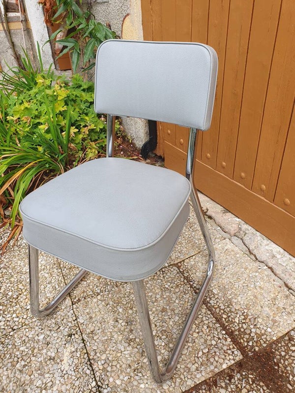 Jolie chaise vintage, années 1970, avec revêtement en simili cuir gris et structure tubulaire chromée. Asseyez-vous confortablement. 2 petits trous des deux côtés.