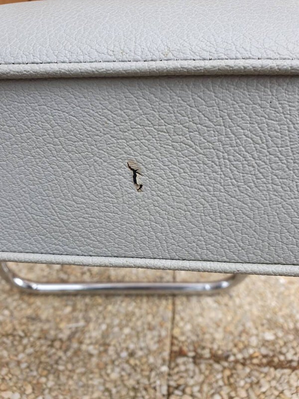 Leuk vintage stoel, jaren ´70 met grijze skai bekleding en chromen buizen frame. Zit lekker. 2 kleine gaatjes aan de beide zijkanten.