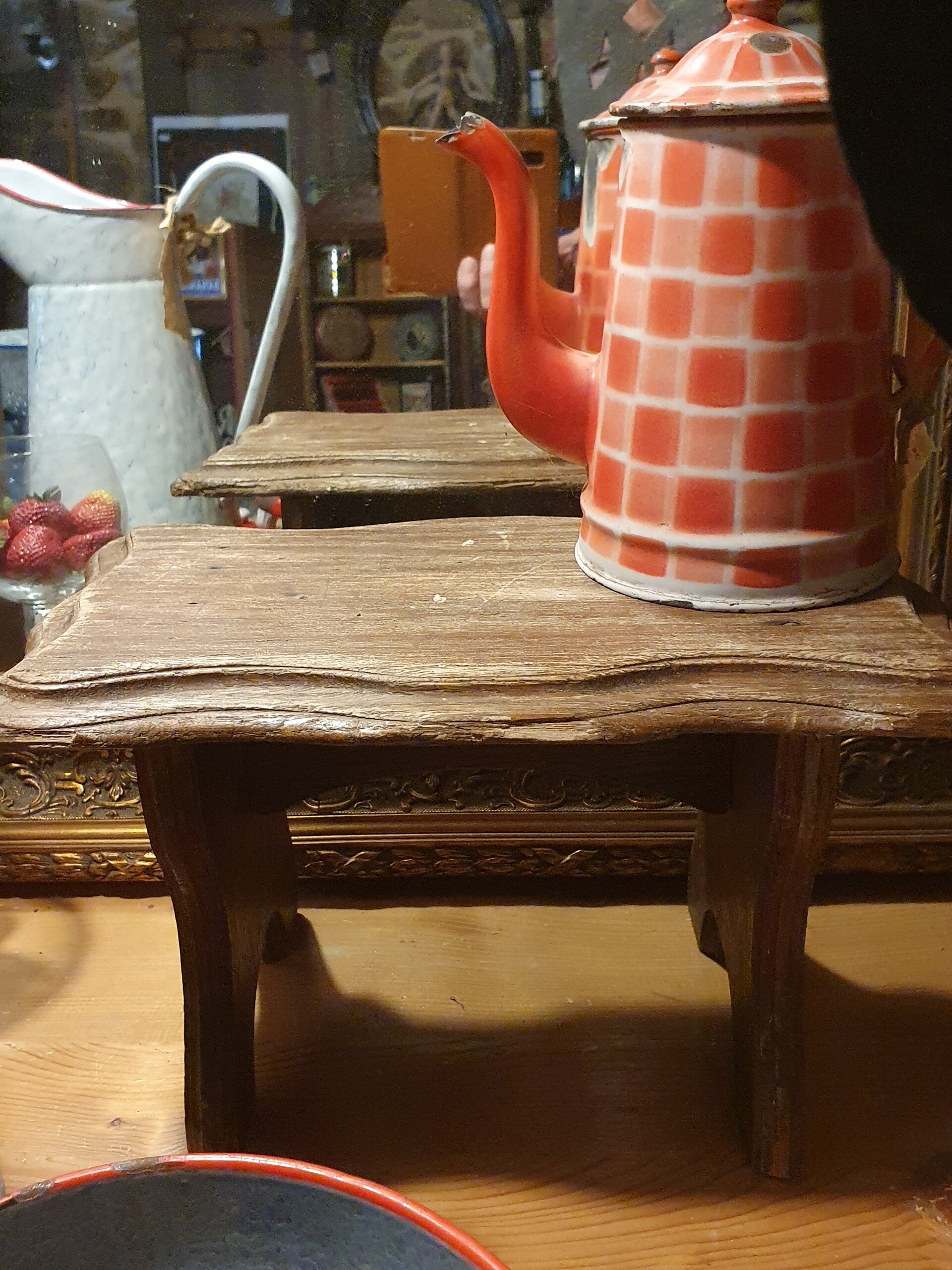 Ze passen precies in de vensterbank, deze kleine krukjes, opzettafeltjes, dus noem ik ze venster bankjes. Deze heeft een mooi oud, geleefd uiterlijk