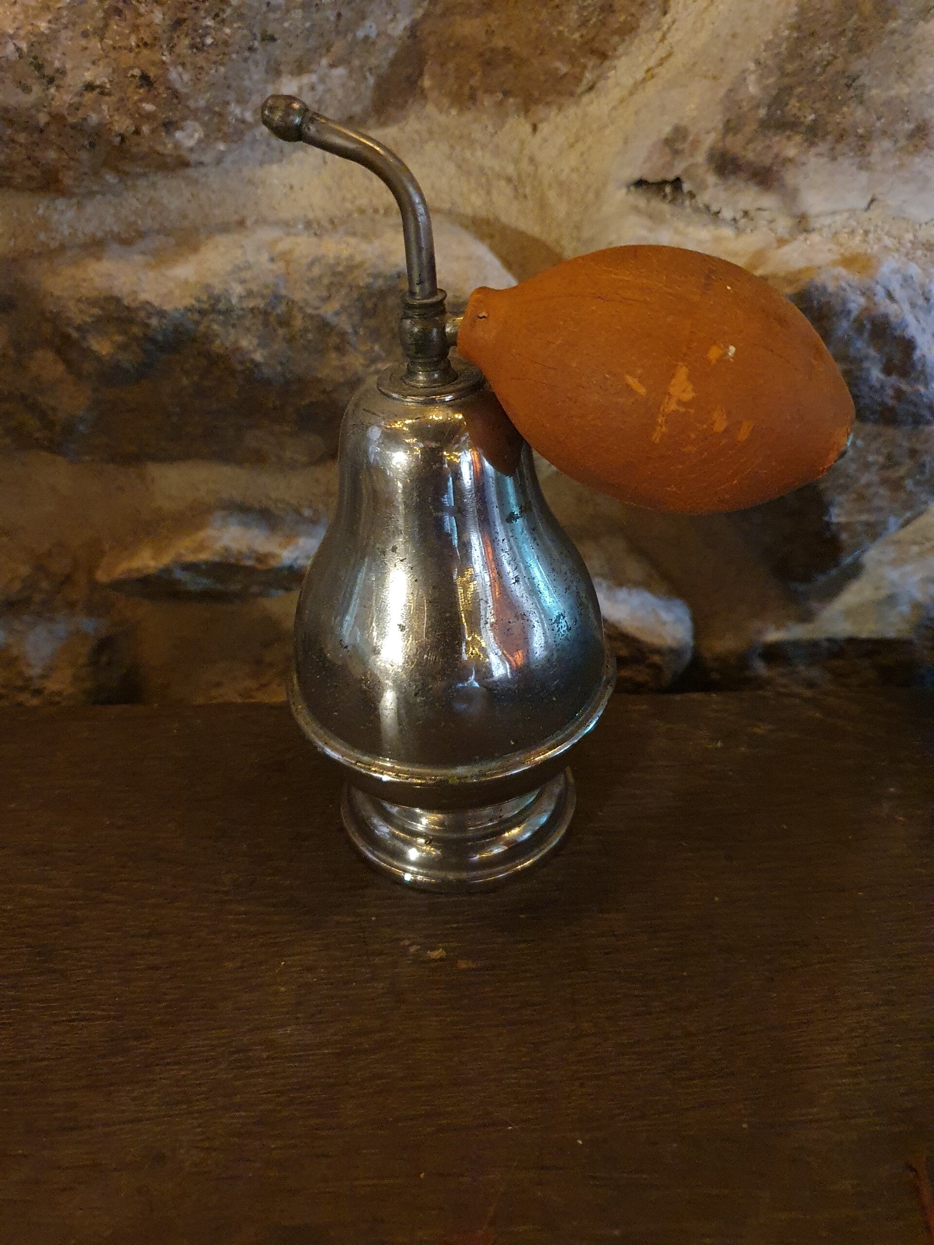 Kappers benodigdheden, een brocante verstuiver in peervorm met knijpbal.