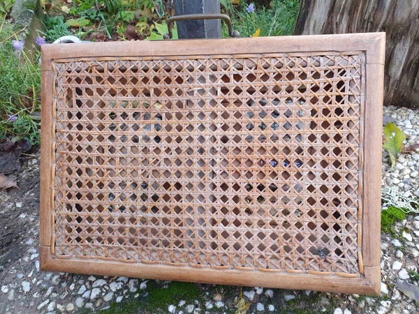 Vintage frans vouwkrukje / bijzettafeltje met webbing en messing handgreepje.