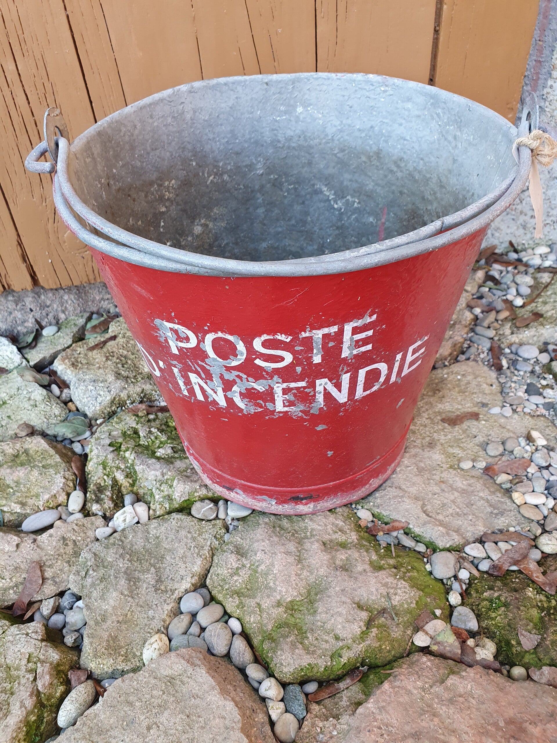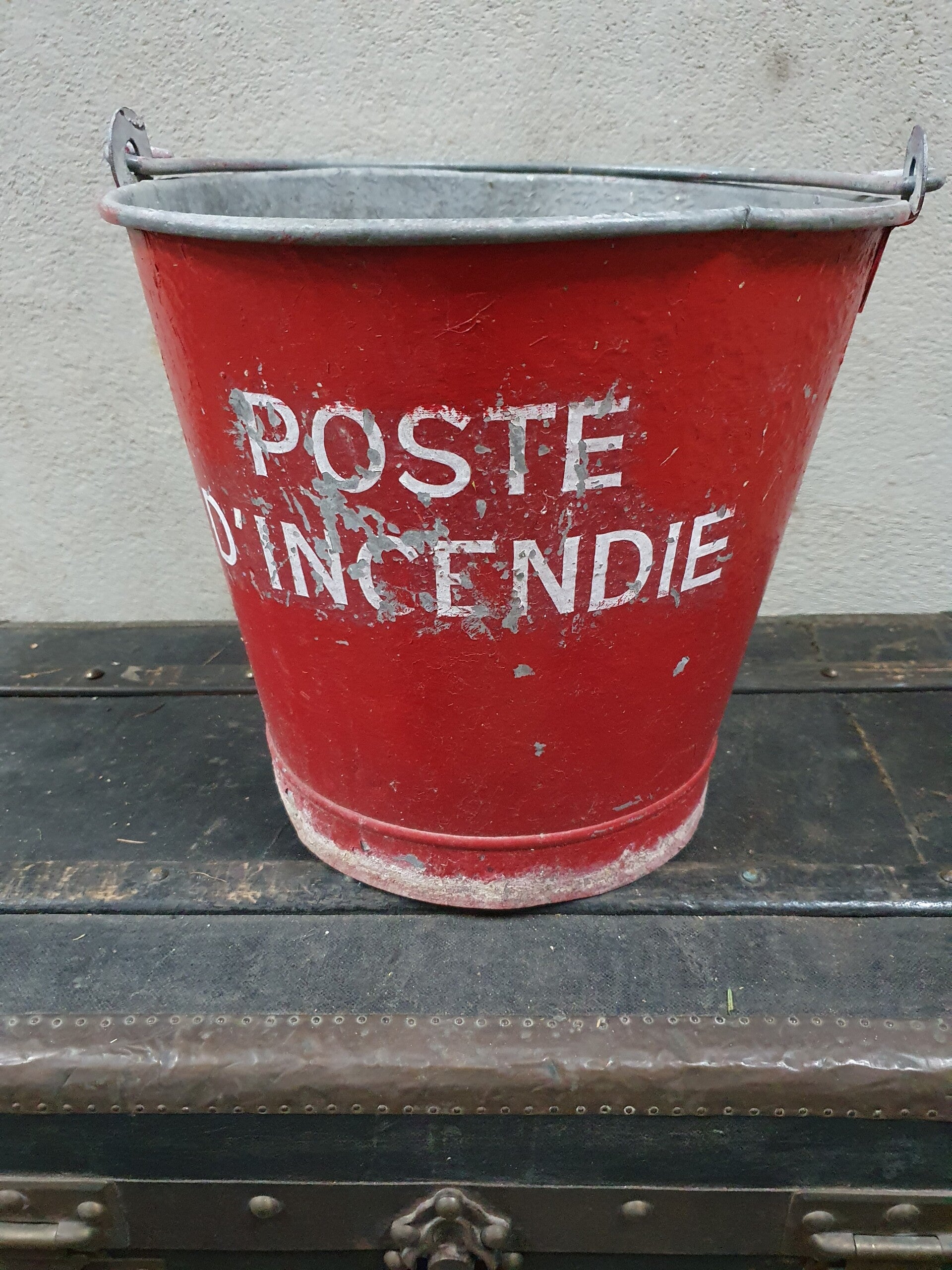 Seau en zinc peint en rouge avec "poste d'incendie" en lettres blanches. Le seau a un trou défectueux en bas au centre.