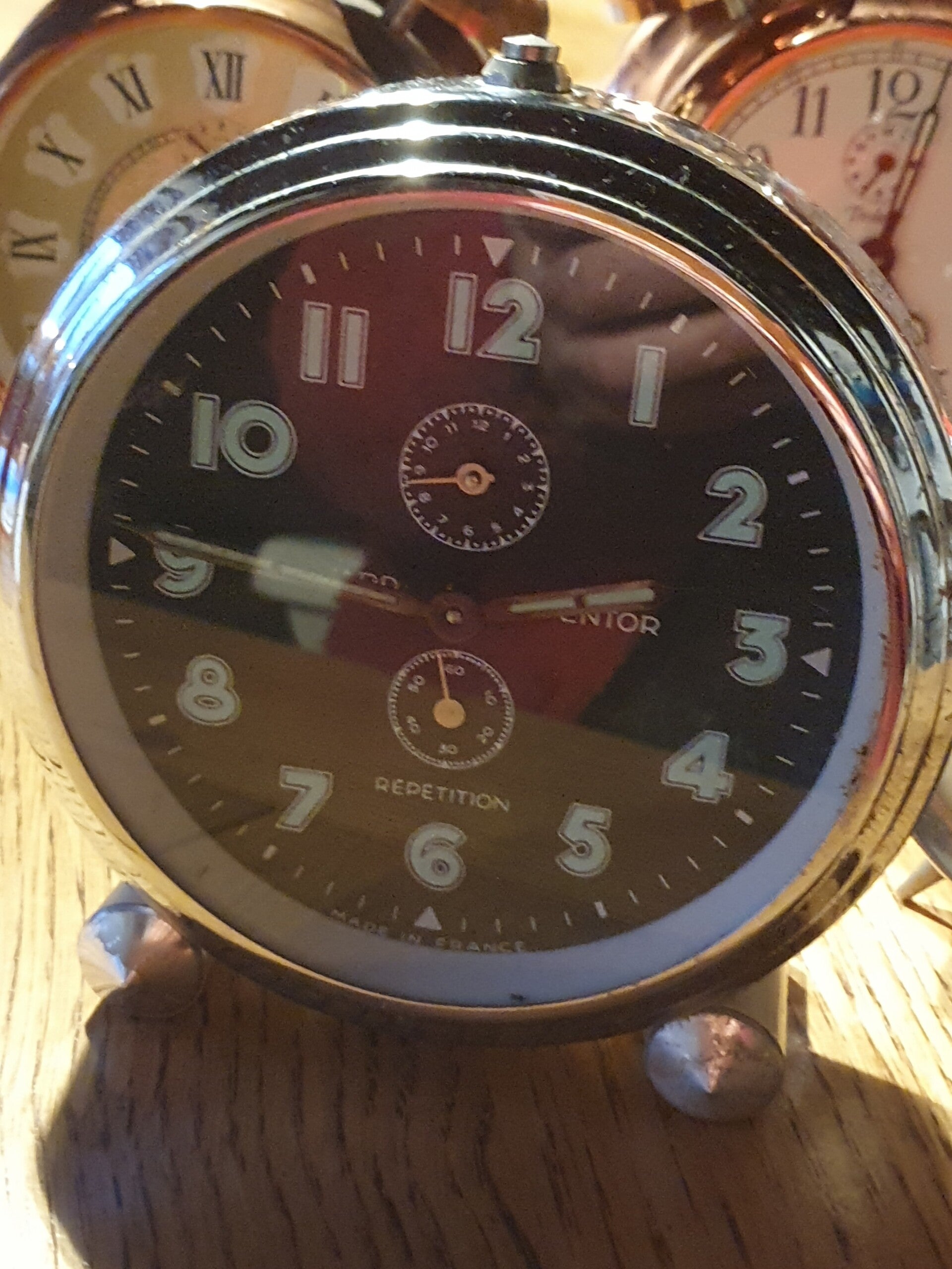 Réveil vintage chromé de la marque Bayard Stentor avec aiguilles lumineuses. Le réveil fonctionne.