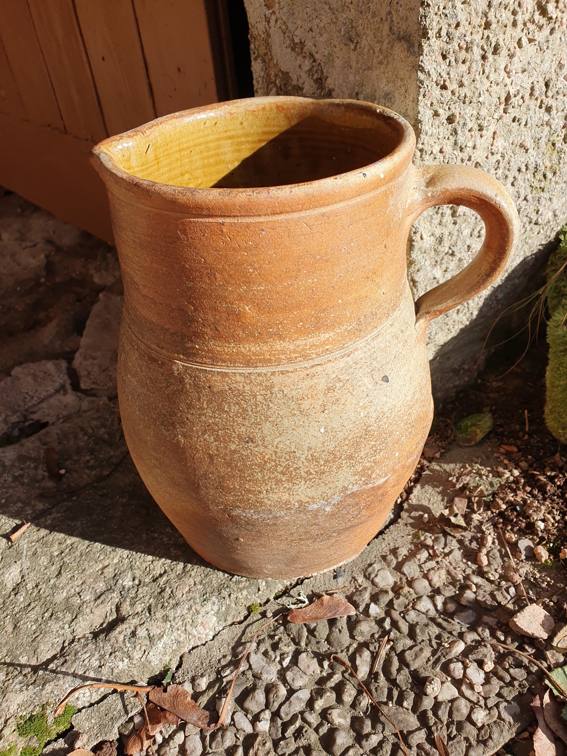 Belle grande cruche en grès avec une anse et un intérieur émaillé. Parfait pour un gros bouquet ! Un petit éclat en haut.
