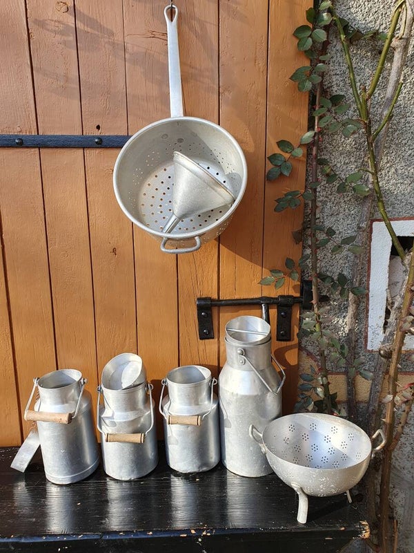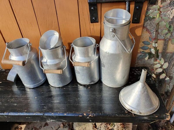 Ancien bidon de lait français sans couvercle, mais avec un manche en bois.