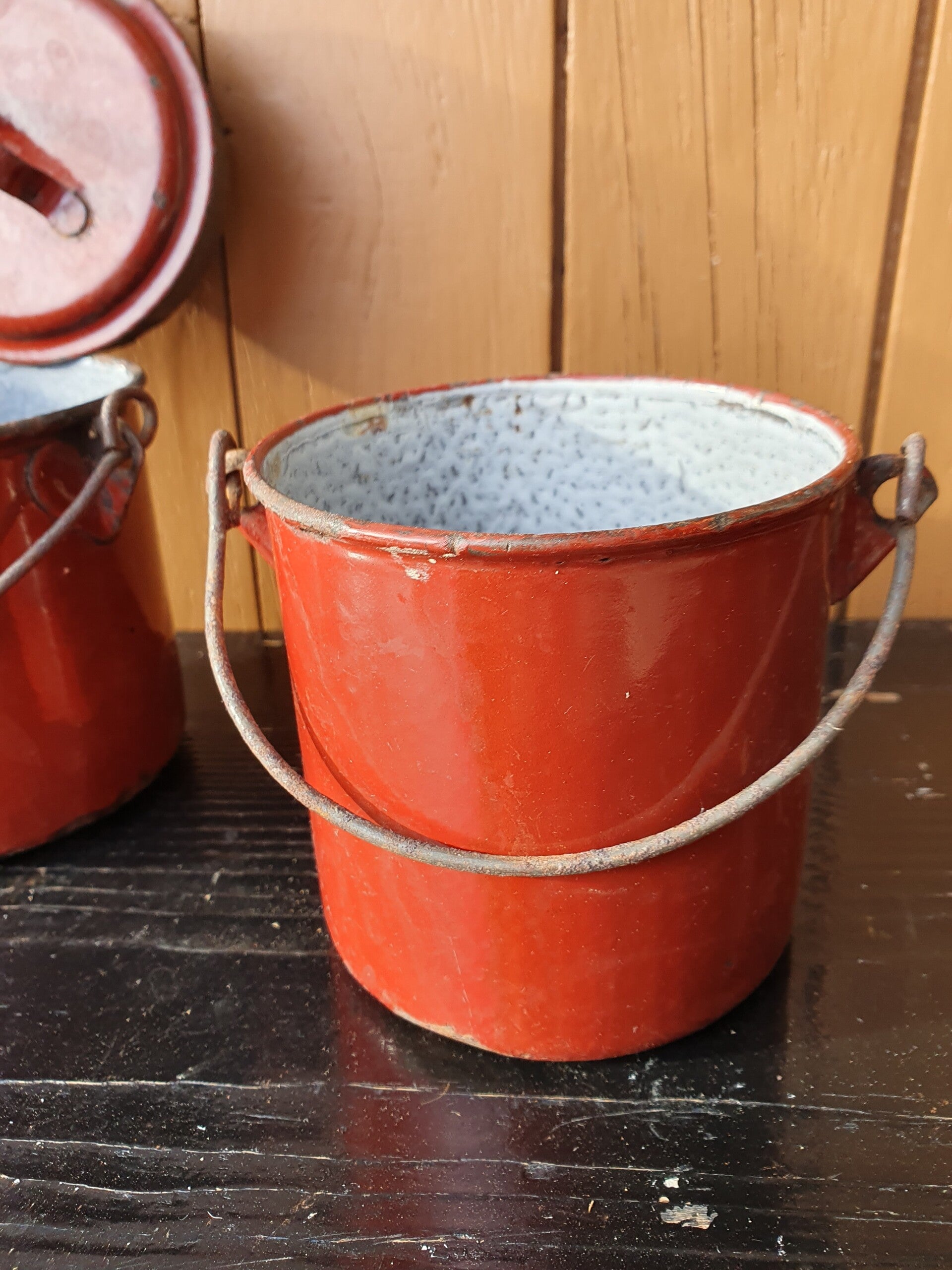 Boîte en émail de couleur marron avec poignée. Email gris trouble à l'intérieur. Hauteur 10 cm, diamètre 10 cm.