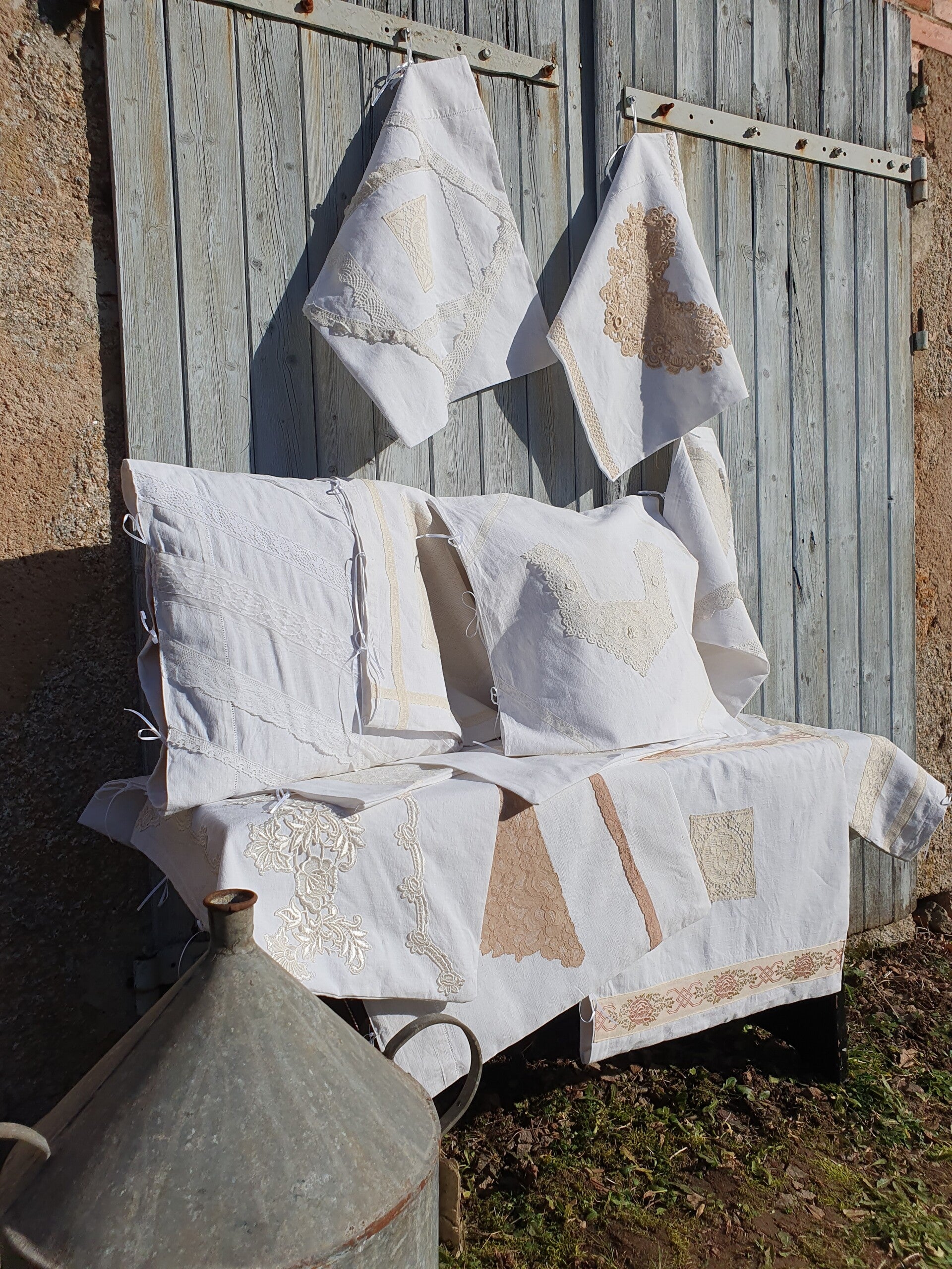 Housse de coussin faite à la main en lin ancien et dentelle française ancienne. C’est tellement agréable d’apprécier à nouveau cette vieille dentelle et son savoir-faire et de l’utiliser de cette façon.