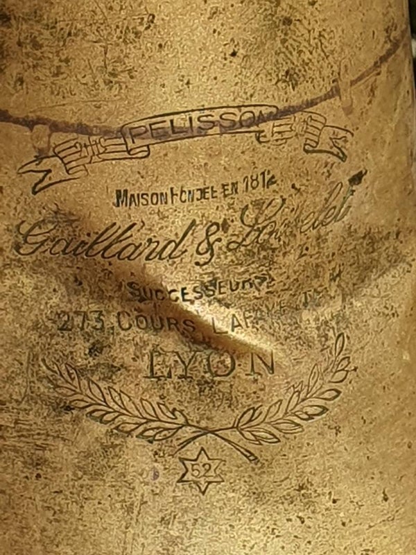 Ancienne trompette Pélisson de la maison Gaillard & Loiselet de Lyon, datant entre 1812 et 1836. La trompette mesure 50 cm de long. On voit où le cuivre est assemblé. Belle décoration.