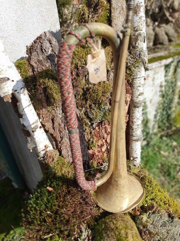 Oude trompet Pelisson van de firma Gaillard & Loiselet uit Lyon, gedateert tussen 1812 en 1836. De trompet is 50 cm lang. Je kunt zien waar het koper aan elkaar gezet is.Prachtige decoratie.