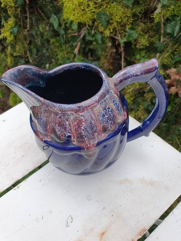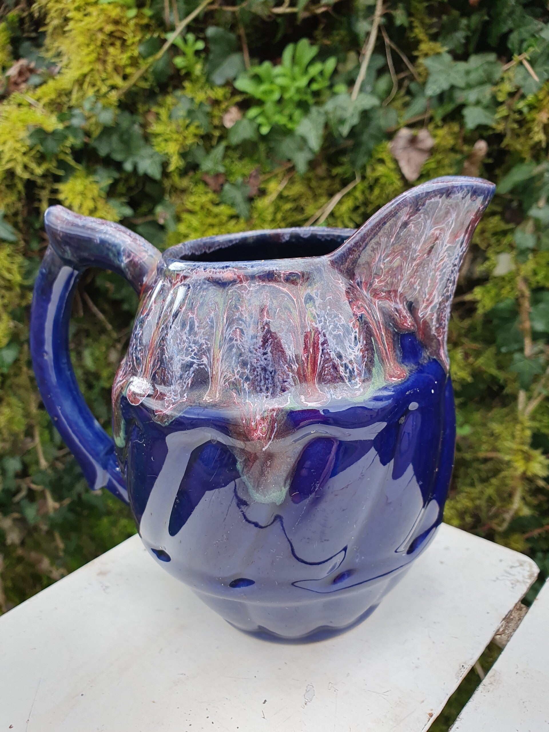 Un pichet à l'anse très élégant en faïence flamée d'un beau bleu profond au décor de coulures marbrées de vert, bordeaux et blanc. En parfait état.