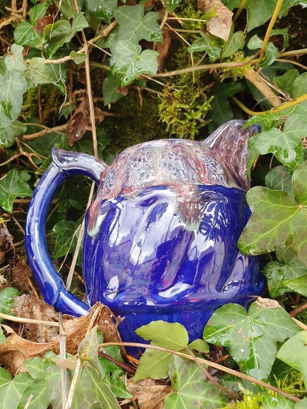Blauw gevlamde keramiek / aardewerk kan met in gouden letters 'Santranges'. Een zeer elegante kan met een handvat van gevlamd aardewerk in een prachtig diepblauw versierd met gemarmerde druppels groen, bordeaux en wit. In perfecte staat.