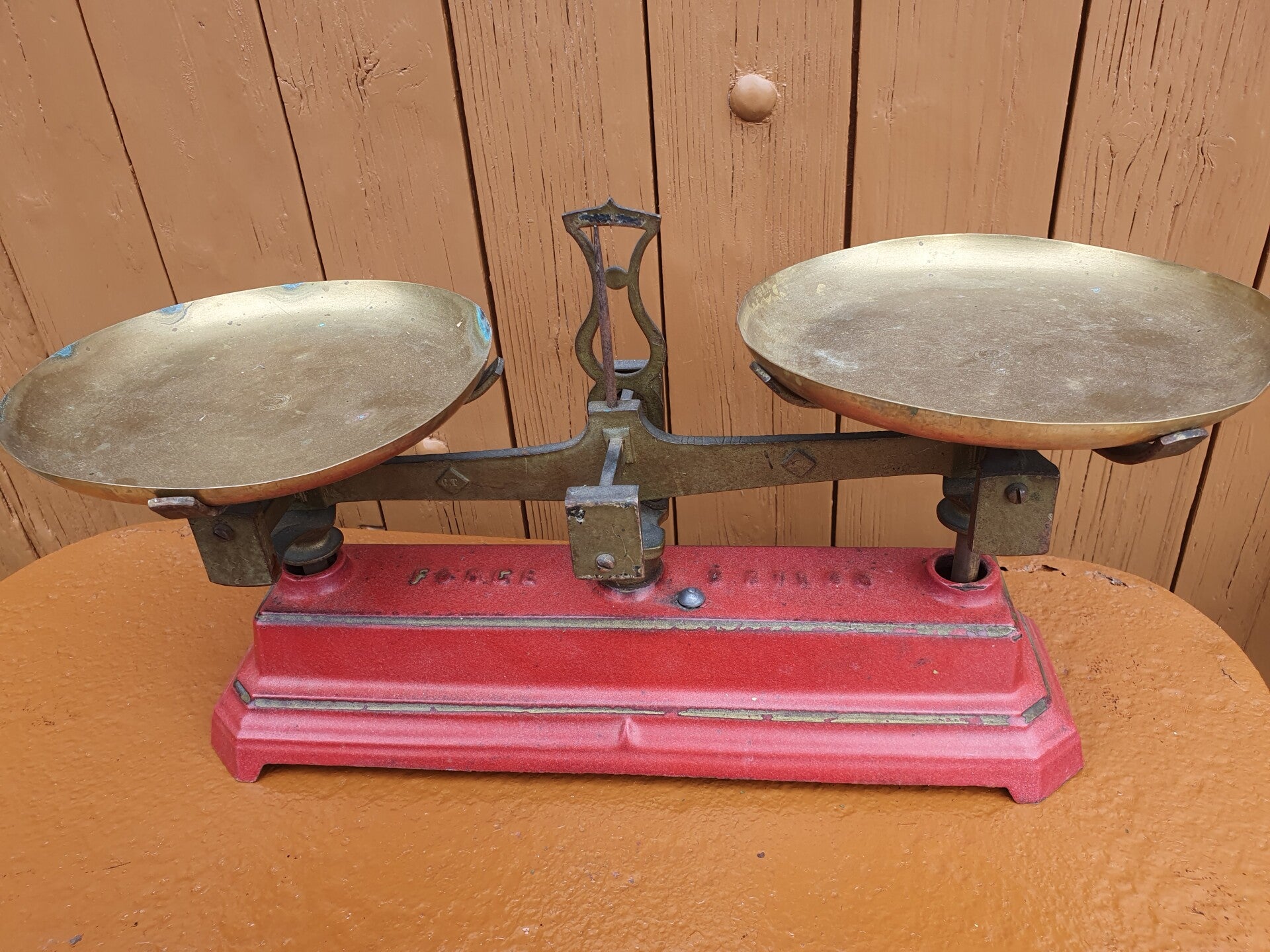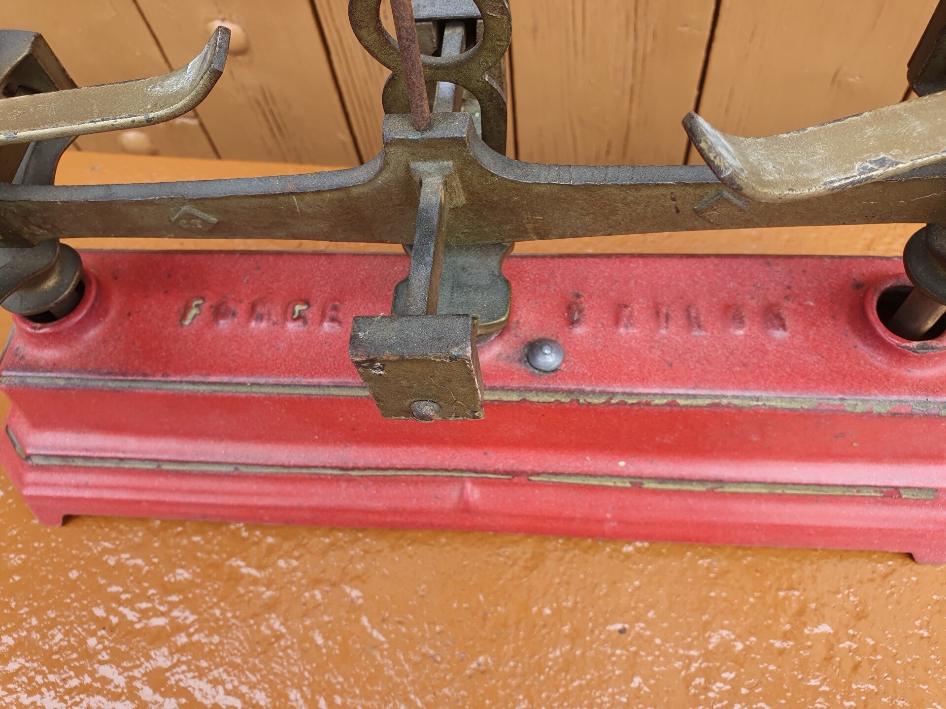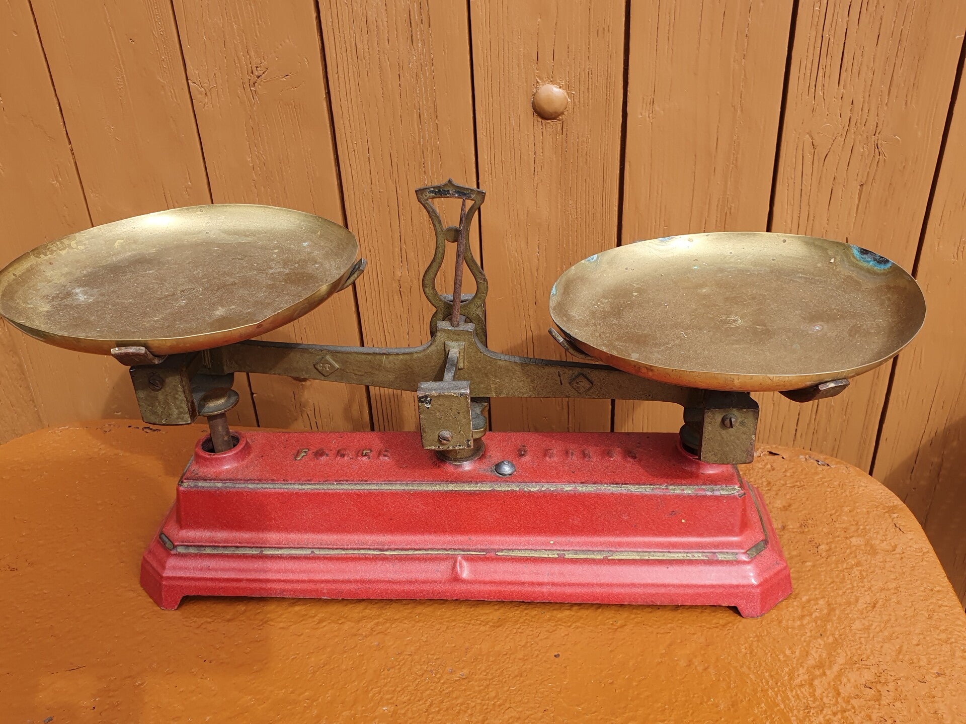Balance française antique en fonte peinte en rouge avec un bord doré et des balances en laiton. Belle décoration dans votre cuisine de campagne robuste. L'échelle mesure 36 cm de long x 11 cm de large et 21 cm de haut au total. Il est parfaitement équilibré et peut peser jusqu'à 5 kilos.