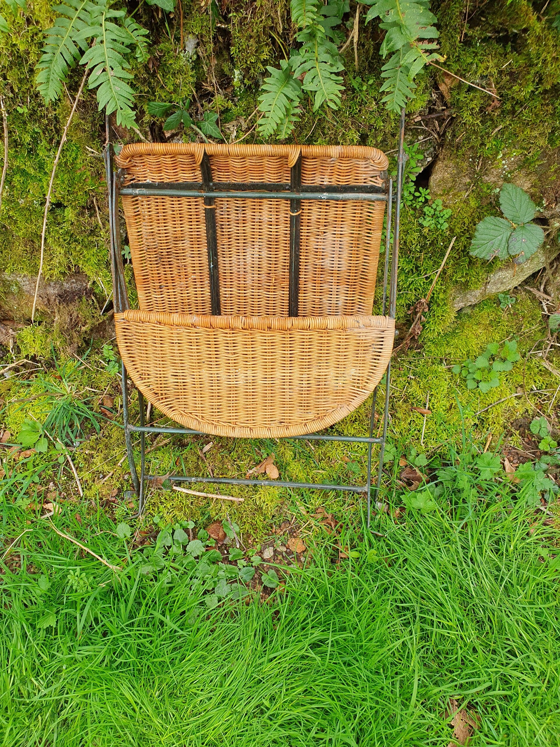 Chaise de jardin française vintage en métal et osier. La chaise est confortable et entièrement pliable, ce qui est utile lorsque vous n'en avez pas besoin.