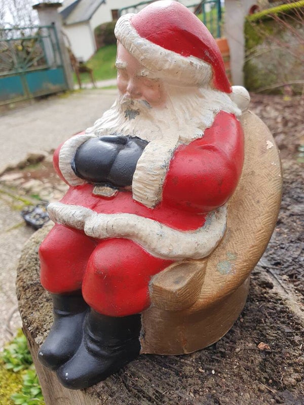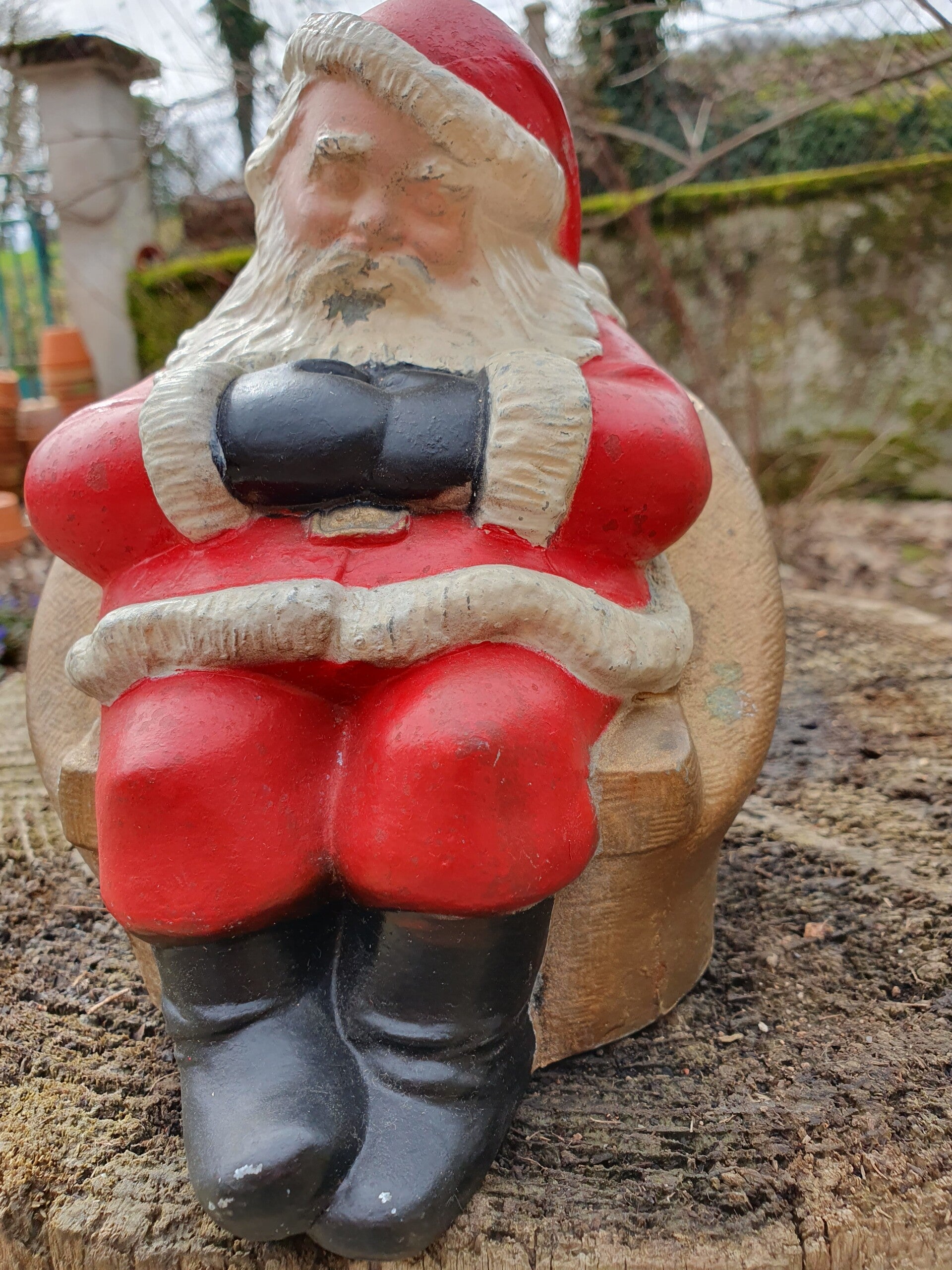 Tirelire vintage en forme de Père Noël endormi sur une chaise, en métal. La tirelire est émise par Banthrico Ind. Chicago. La tirelire a été fabriquée aux États-Unis d'Amérique dans les années 1960 et fait la publicité de Security Savings and Loan Ass'n. Le pot est en métal et peint. (Ça et là la peinture est un peu usée), il représente le Père Noël dans son traditionnel costume rouge bordé de fourrure blanche. Vraiment un objet de collection !