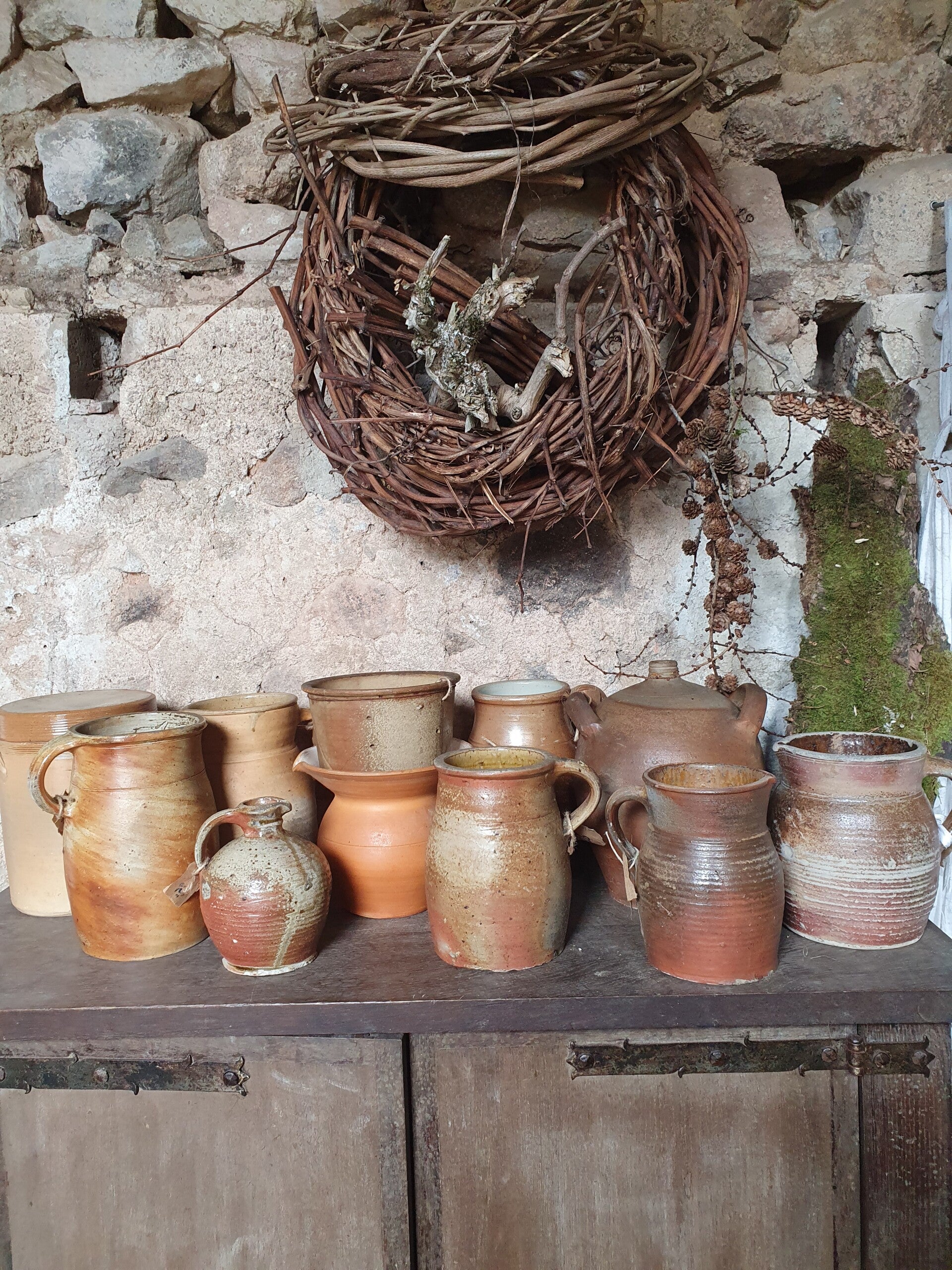 Belle cruche ancienne française en grès, faïence vernissée, avec un bord. La cruche mesure 20 cm de haut et a un diamètre de 14 cm.