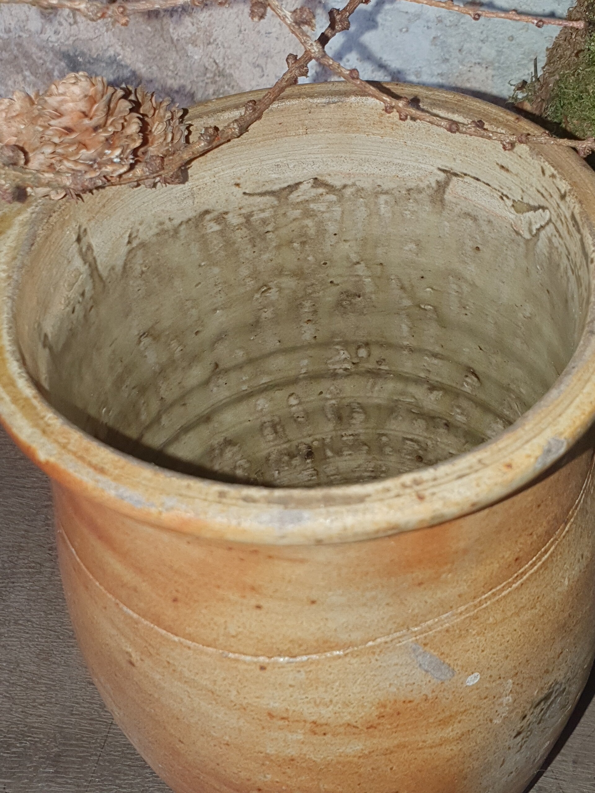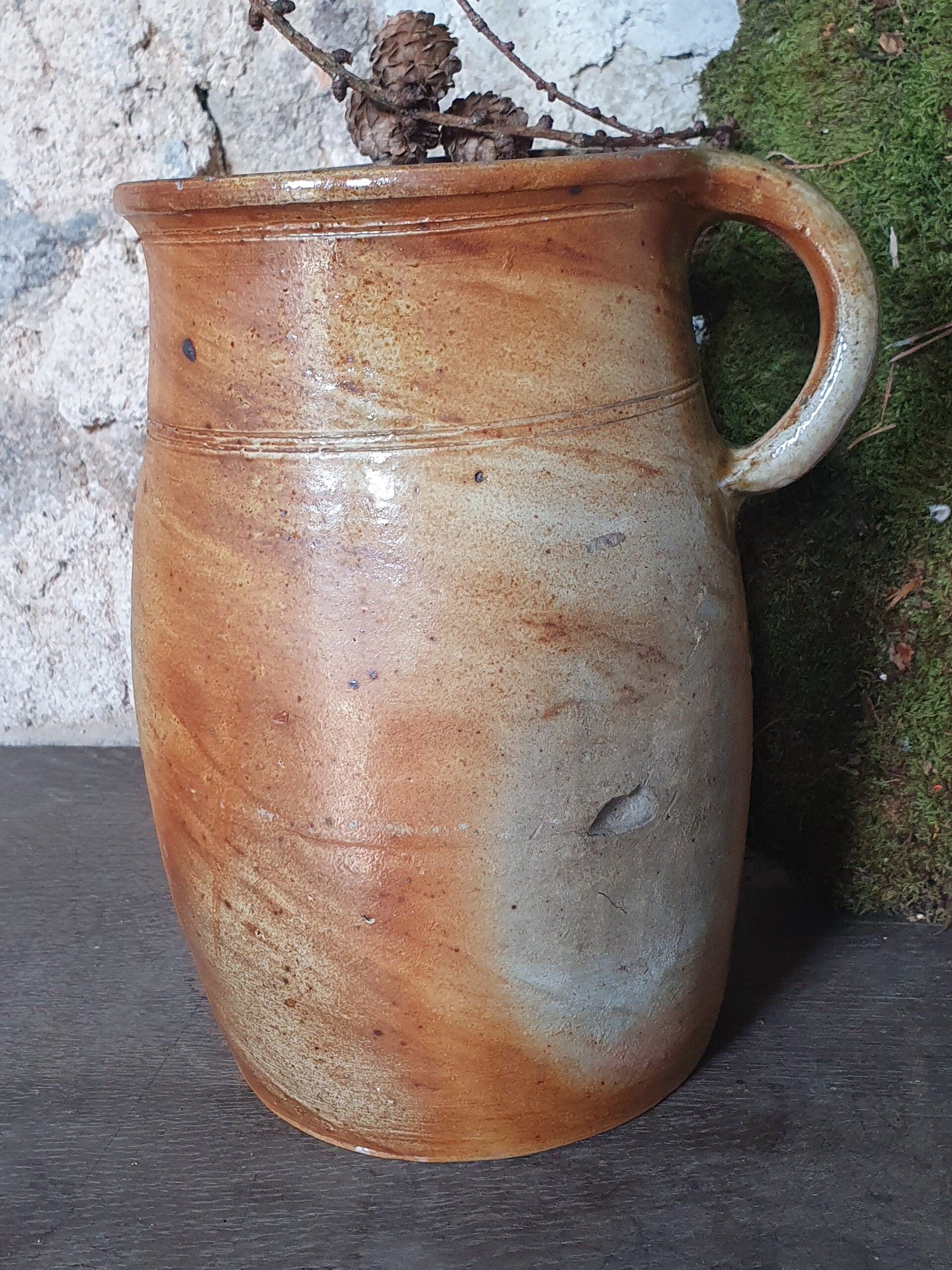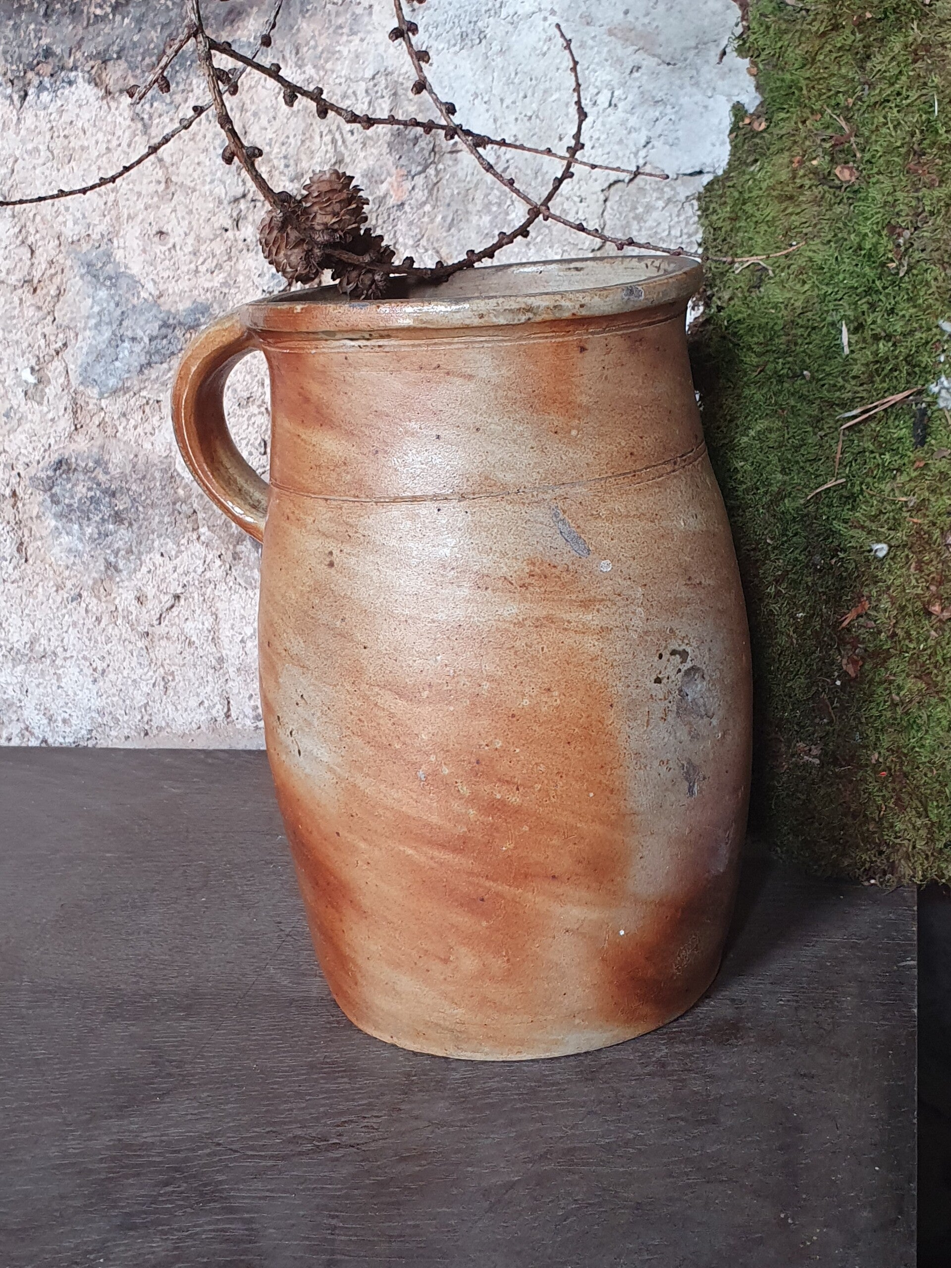 Mooie oude franse kan van gres, geglazuurd aardewerk, met een rand. De kan is 20 cm hoog en heeft een diameter van 14 cm.