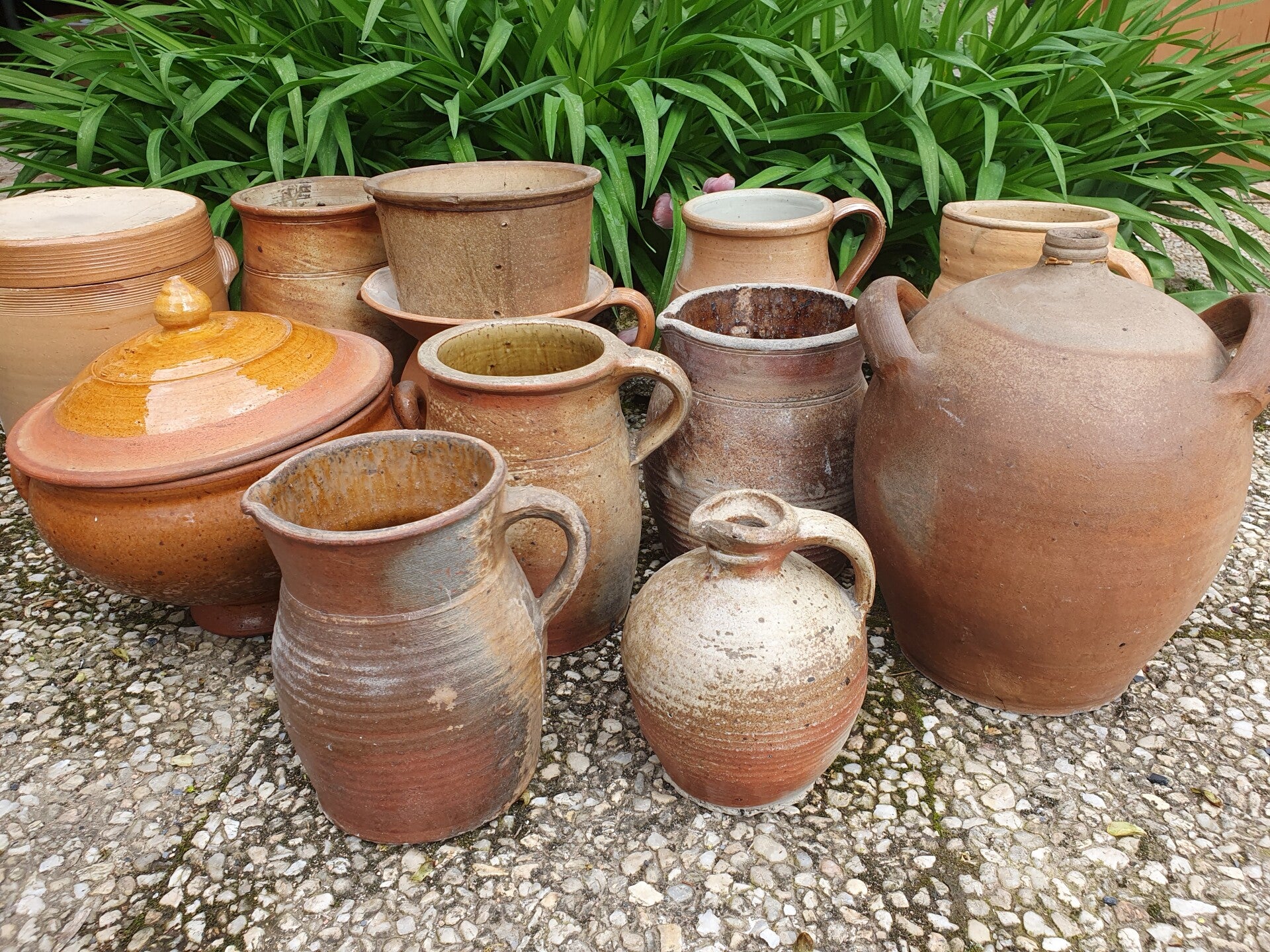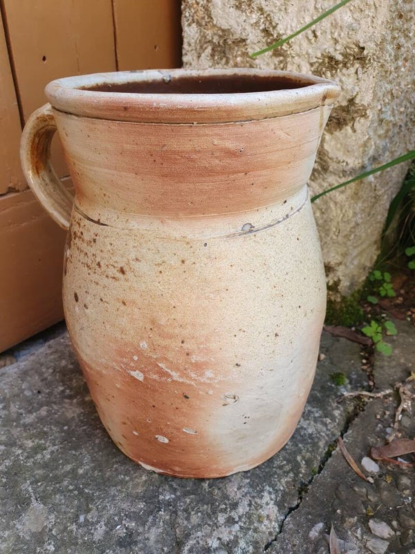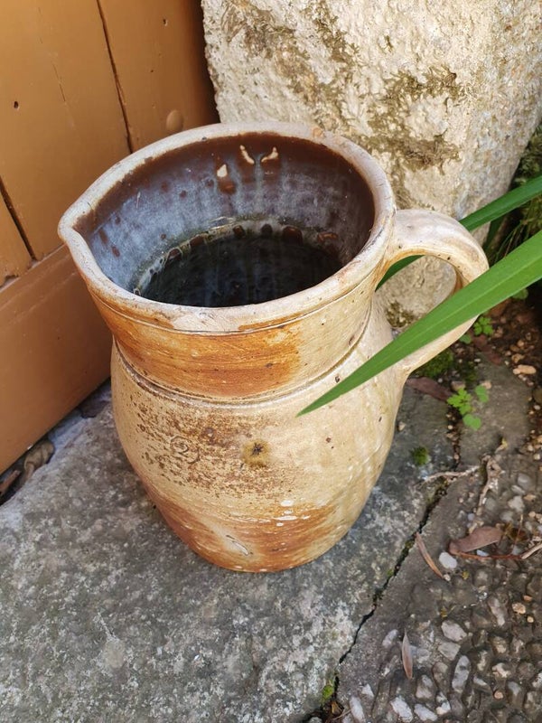 Belle cruche ancienne française en grès, faïence vernissée. La cruche c'est marquée du numéro 2, mesure 24 cm de haut et a un diamètre de 14 cm. Dommage pour le bord.