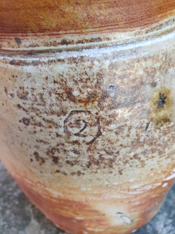Mooie oude franse kan van gres, geglazuurd aardewerk. De kan is gemerkt met nummer 2, is 24 cm hoog en heeft een diameter van 14 cm. Beschadiging aan de rand.