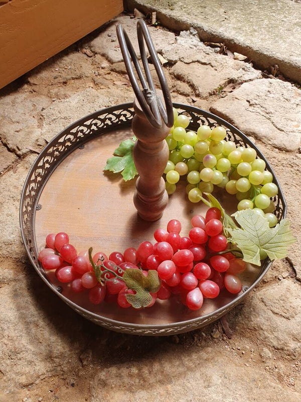 Etagère of serveerblad van hout en metaal van 35 cm diameter.