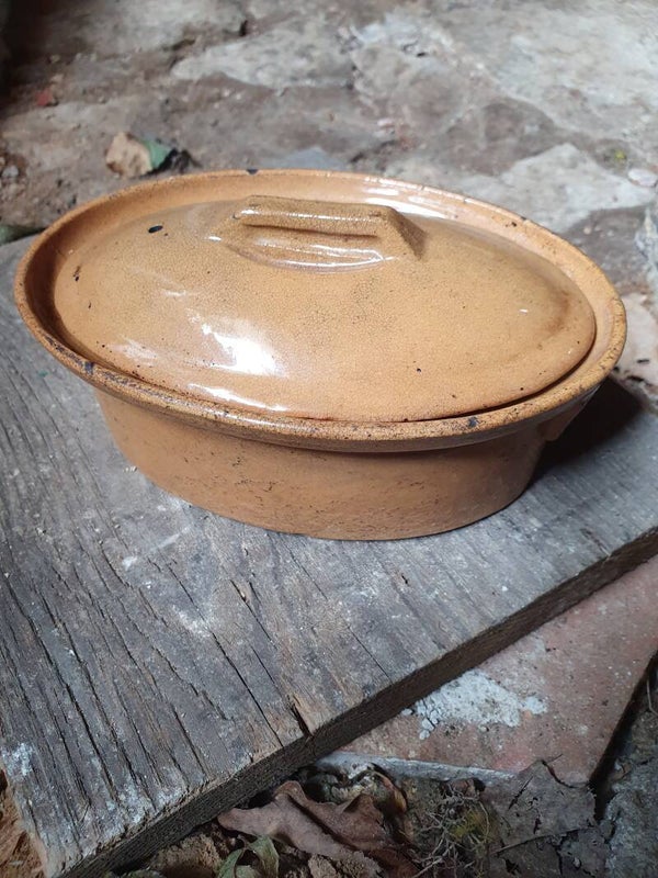 Jolie escalope de pâté beurrée ancienne mesurant 17 cm de long x 12 cm de large x 6 cm de haut. Petits dégâts au couvercle.