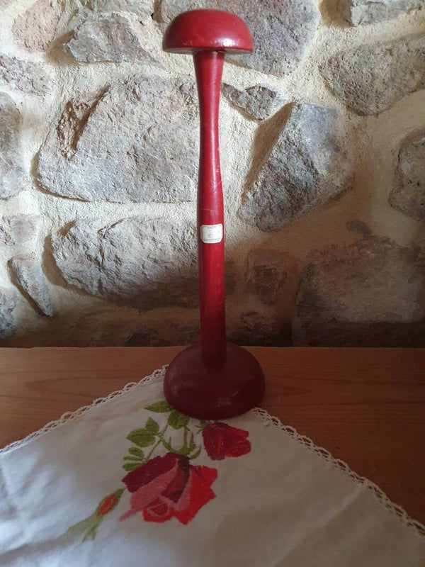 Oude hoeden- of pruiken standaard van rood geverfd hout met een sticker van Bazar D'Amsterdam.