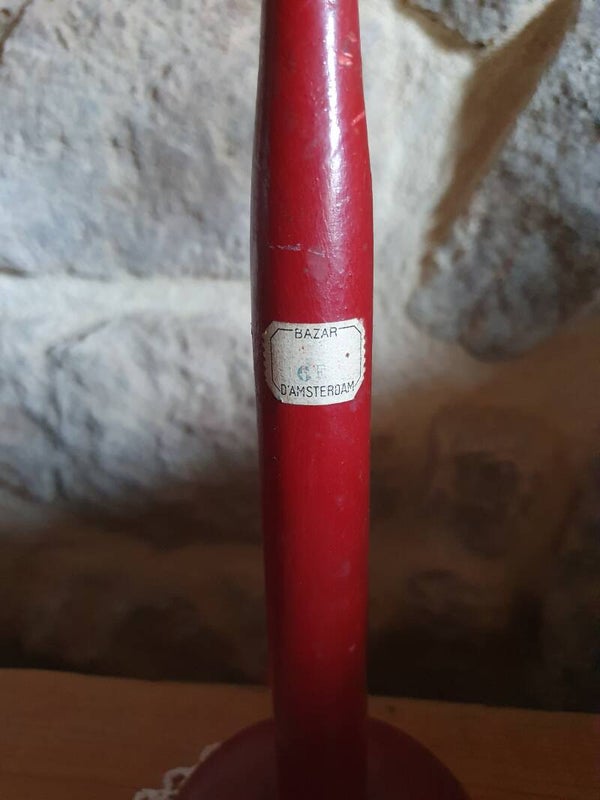 Ancien porte-chapeau ou perruque en bois peint en rouge avec un autocollant du Bazar D'Amsterdam. Le Grand Bazar de l'Ouest et d'Amsterdam a ouvert un magasin en 1876 dans le 9ème arrondissement de Paris, près de la gare Saint-Lazare et il s'est agrandi au fil du temps (8-10-12 rue d'Amsterdam). Le Bazar propose des articles à prix marqués. Le bâtiment a été détruit dans les années 1970.