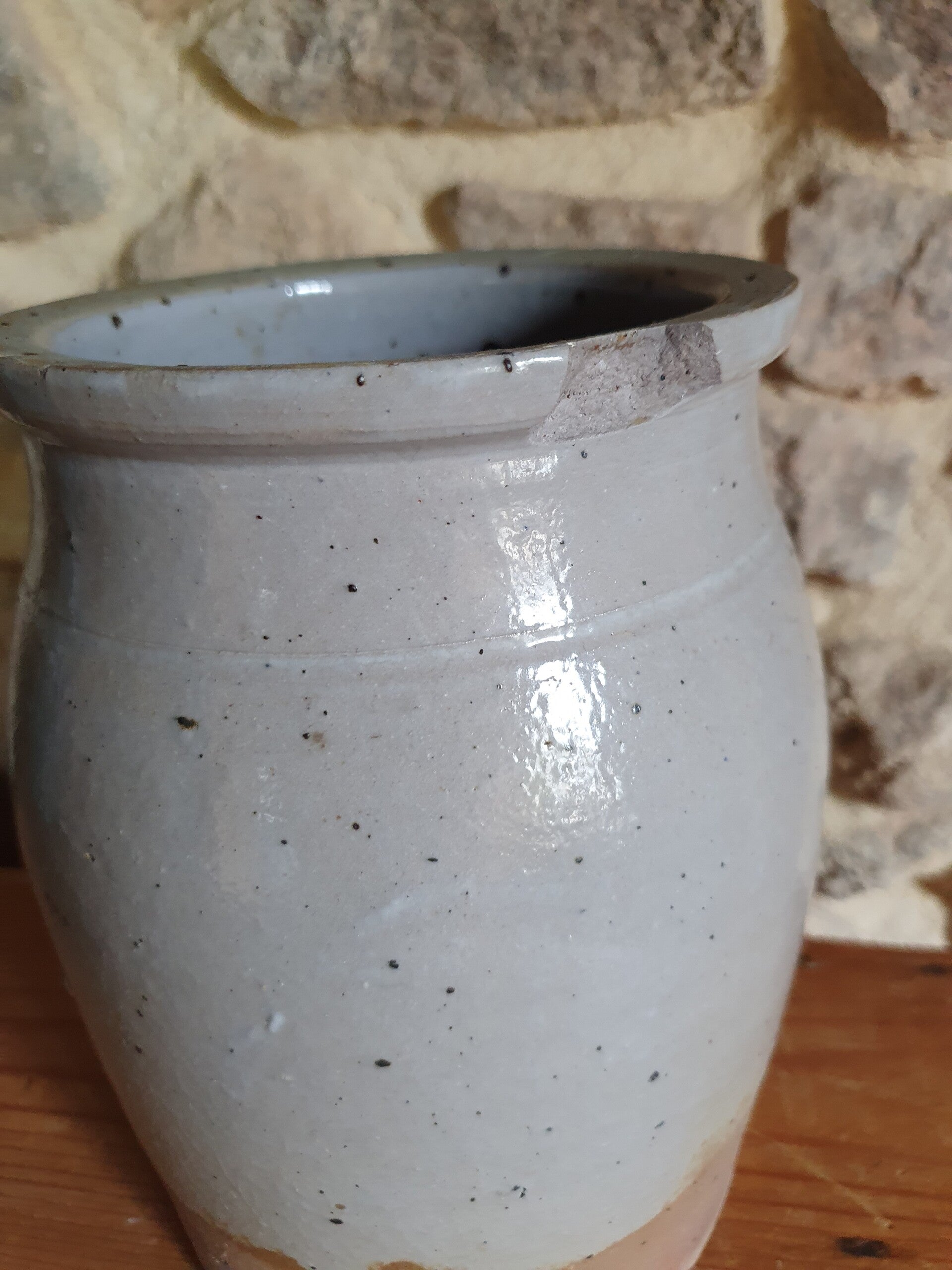 Belle cruche n°1 en grès émaillé gris sobre moucheté. Un peu abîmé sur le bord, mais quand même une photo. Le pichet en grès mesure 20 cm de haut avec une ouverture de 13 cm.