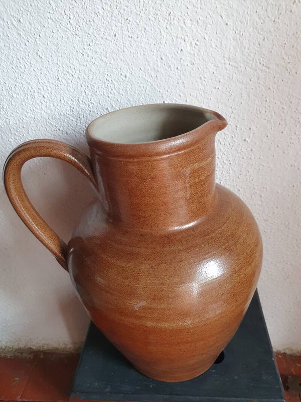 Bonne cruche en grès brun teinté de 5 litres. Magnifique avec un gros bouquet de fleurs (de soleil). La cruche est marquée "Gress Bonny fait à main", faite à la main. La cruche mesure 29 cm de haut et a une ouverture de 10 cm.