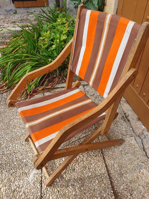 Chaise de plage vintage avec accoudoirs et tissu marron orangé. La chaise est en bois de hêtre robuste et pliable.
