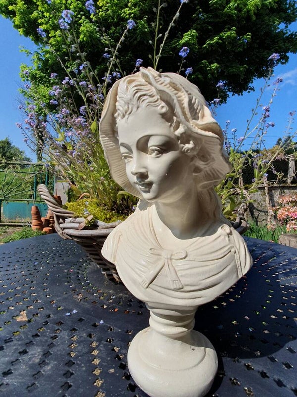 Mooie oude buste van een meisje genaamd Antoinett, met fijne details. Leuk om in huis of in de tuin te plaatsen. Het beeld is 29 cm hoog.