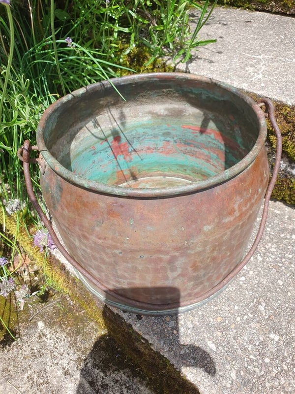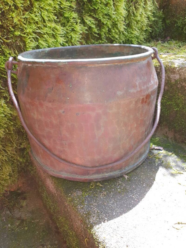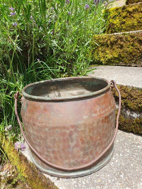 Mooie antieke koperen ketel, waar je het vakmanschap en de hamerslagen in kunt zien.Leuk om er bijvoorbeeld je aanmaakhout in te bewaren.