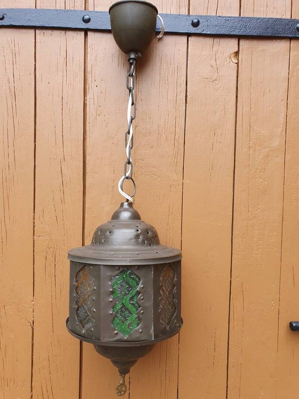 Leuke oosterse lamp van koper met gekleurd glas. De lamp is voorzien van een fitting en een draad. Geeft mooi licht.