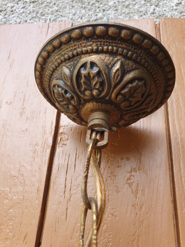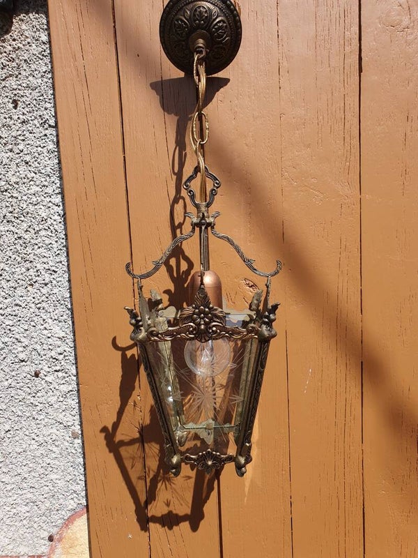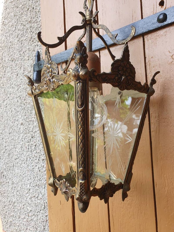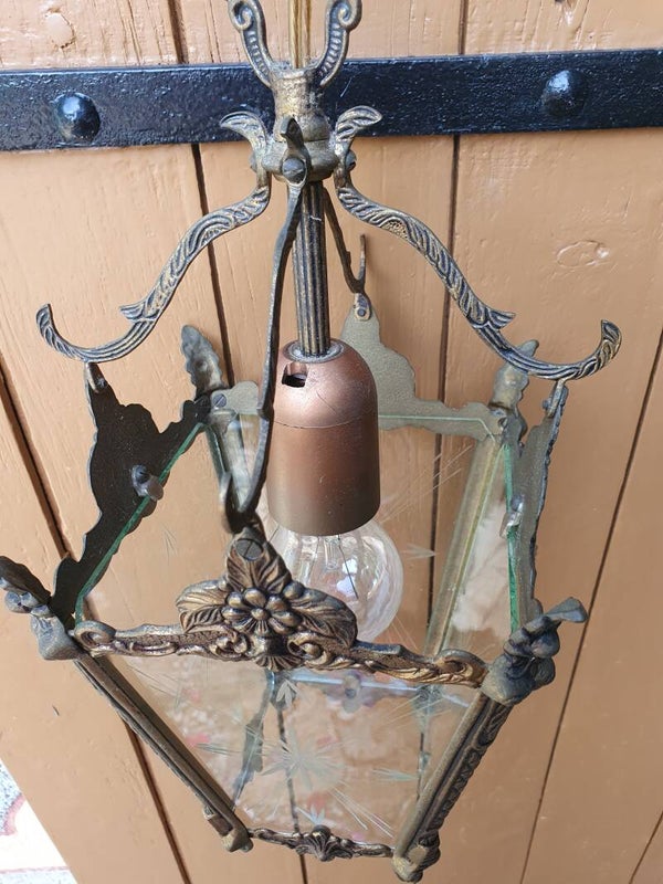 Vintage lamp, model lantaarn van rijk versierd messing en geslepen glas. Mooi voor in een hal. De lantaarn is voorzien van fitting en snoer.