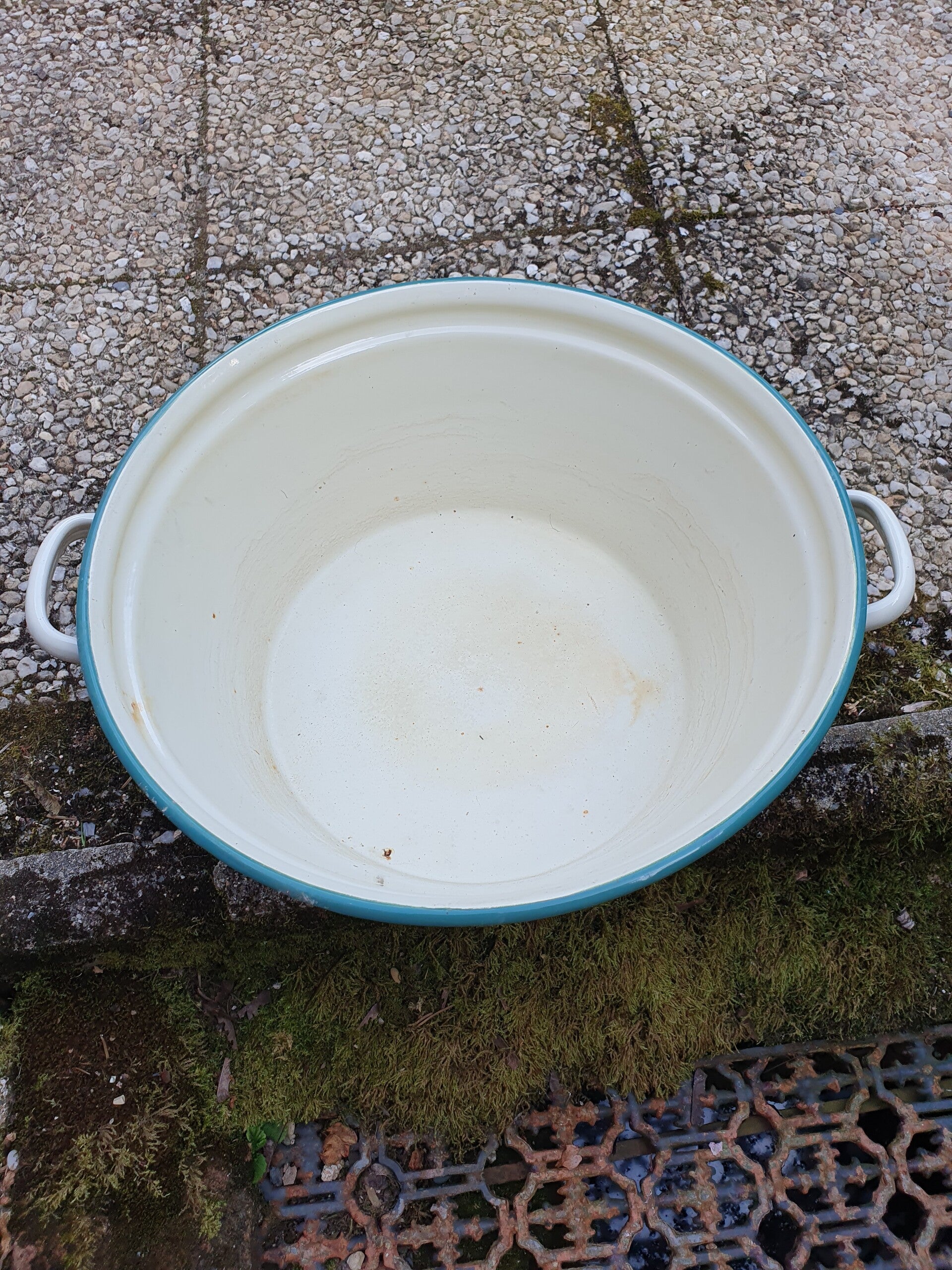 Grote vintage emaillen teil in beige met een groene rand en 2 oren. De diameter is 50 cm , de hoogte is 18 cm. In goede staat.