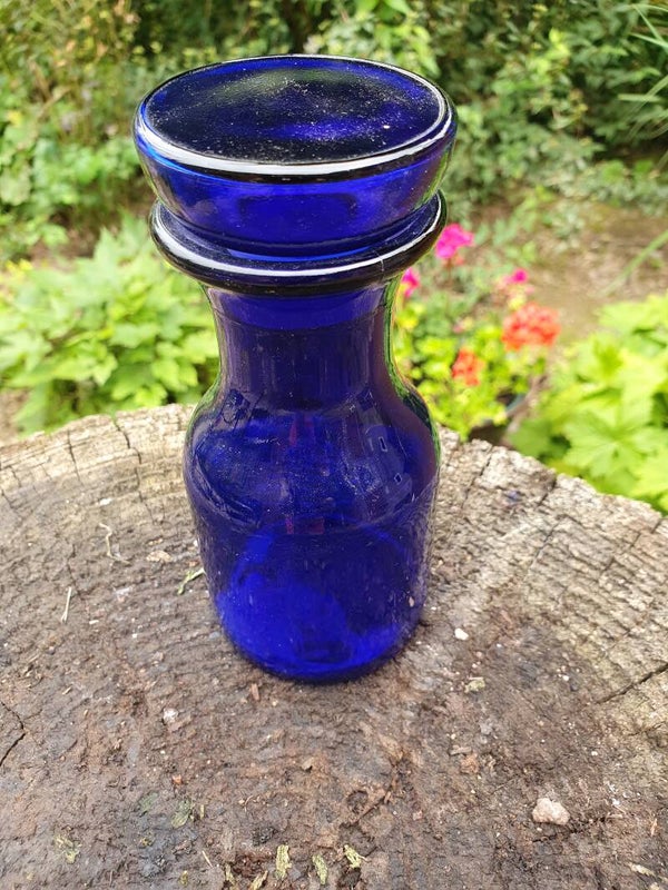 Leuke kobaltblauwe apothekersfles uit 1970, gemaakt in België, met grote stop. De fles is 9 cm hoog en heeft een diameter van 4,4 cm.