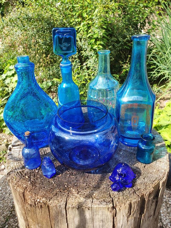 Vintage fles, aquablauw van wodka? De fles is 22 cm hoog. Leuk om er een paar bij elkaar te zetten.