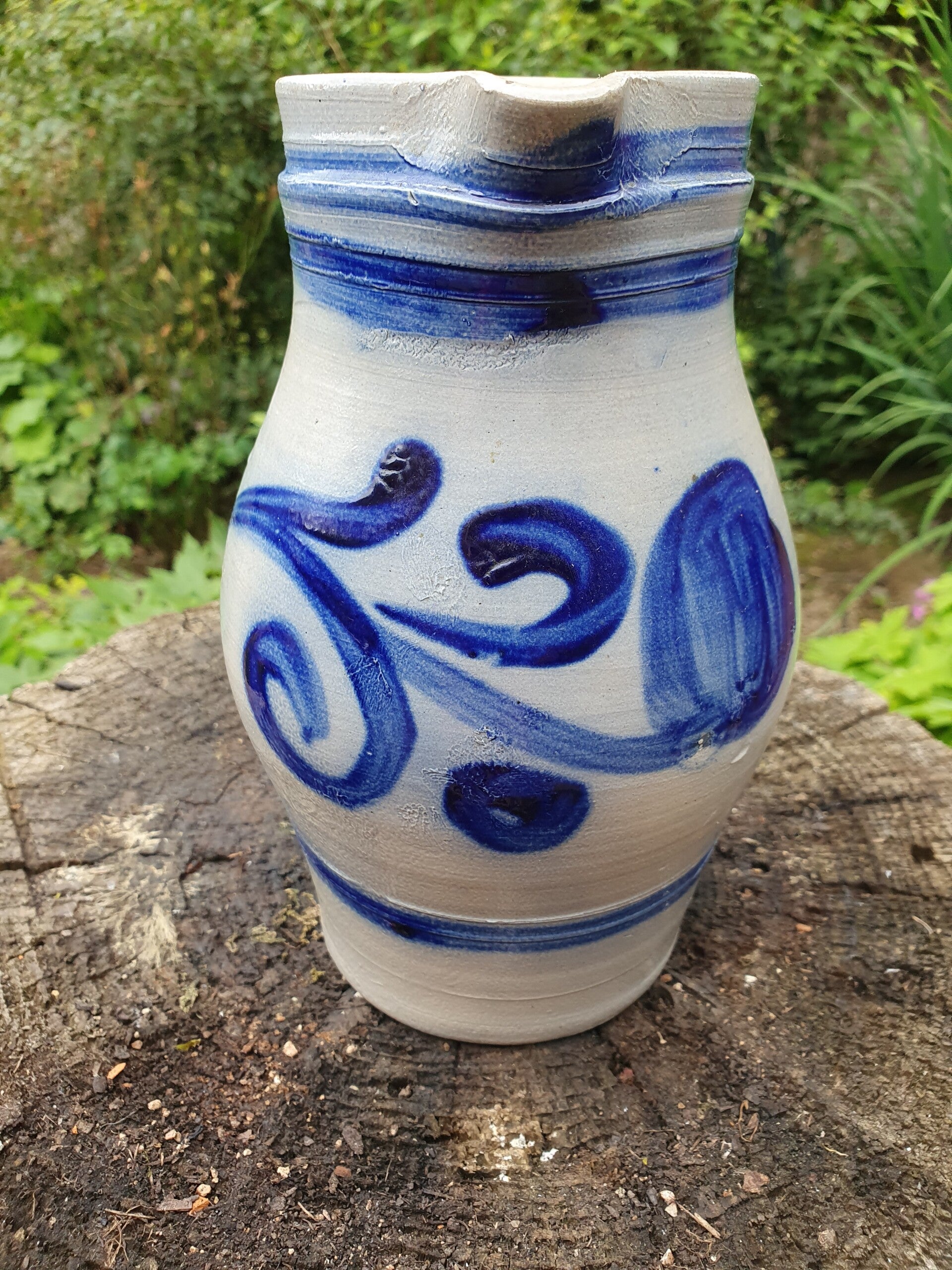 Vintage keulse aardewerk kan van 20,5 cm hoog en met een opening van 8 cm.