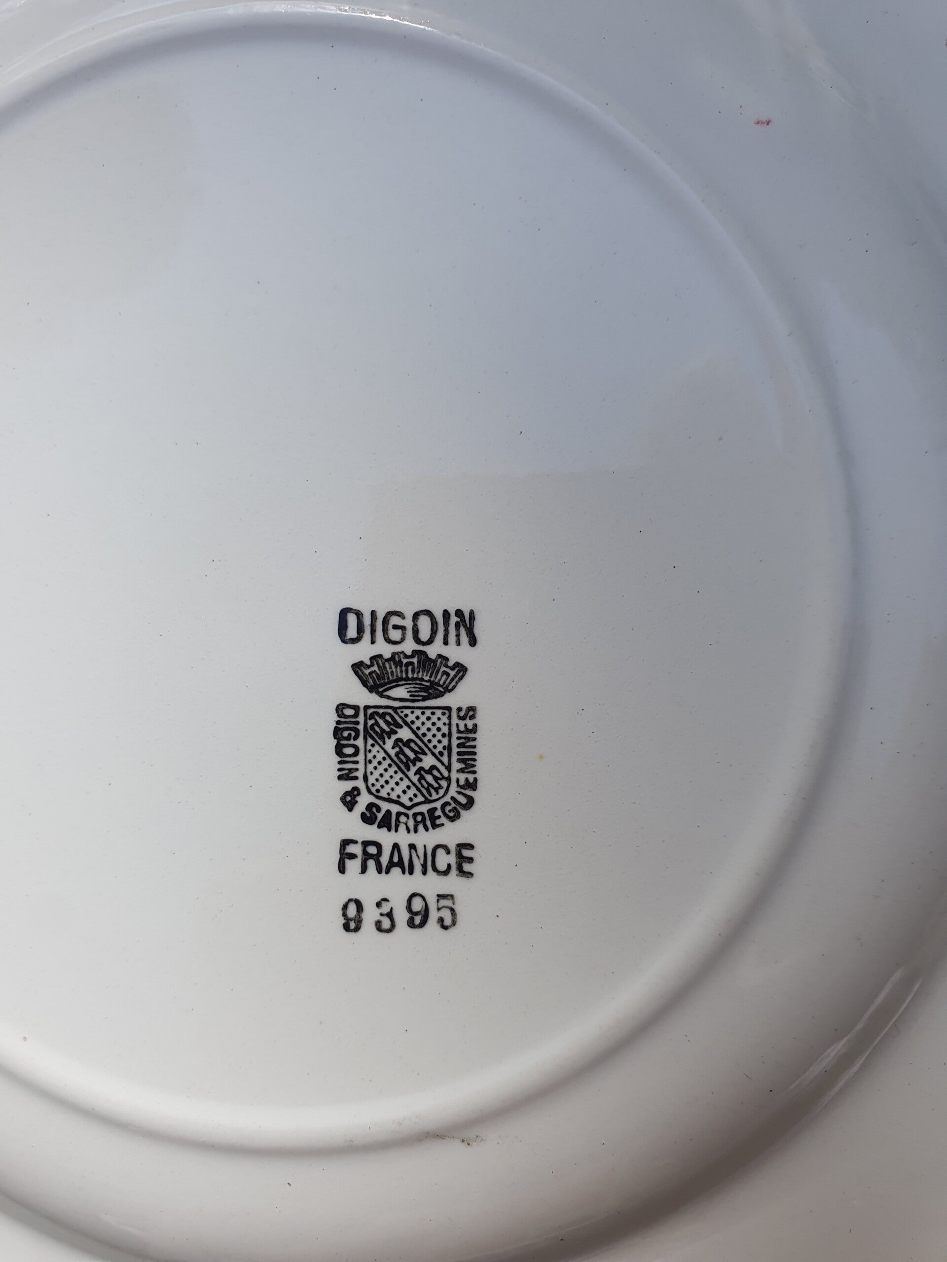 Vintage bord Digion & Sarrequemines nummer 9395 met een sjabloon gespoten donkerrode rand.Het bord heeft een diameter van 22 cm
