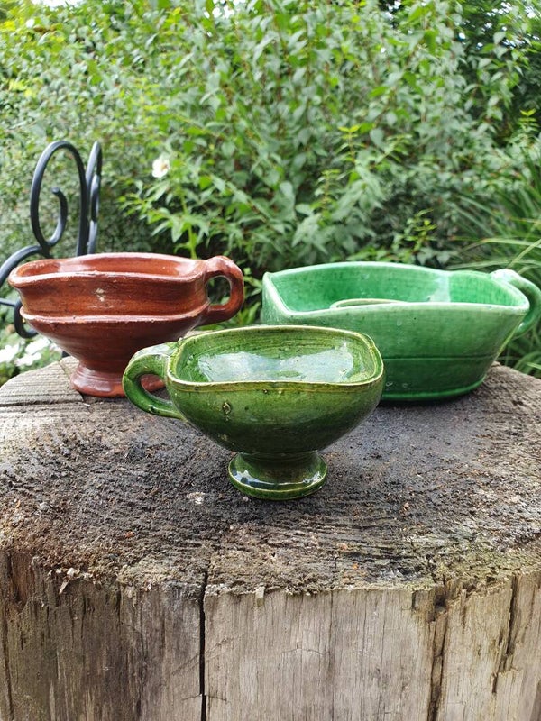 Leuk groen aardewerk schaaltje met oor van 8,5 x 8,5 x 6 cm hoog. Ook leuk als kandelaar.