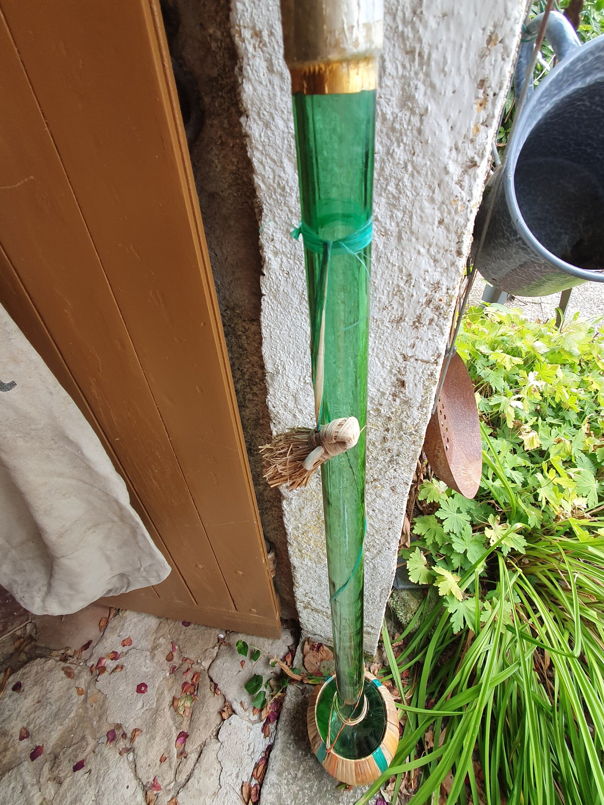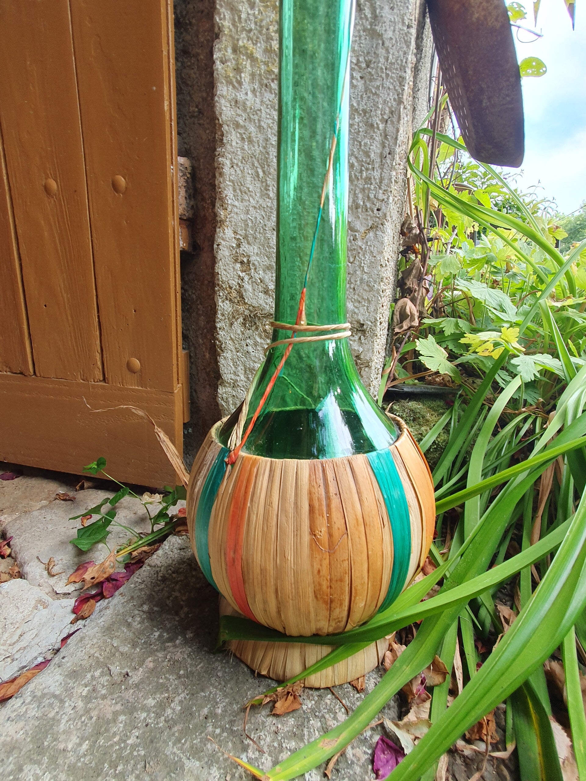 Een supergrote vintage chianti fles uit 1969 van 1,20 m hoog! in een rieten mand.