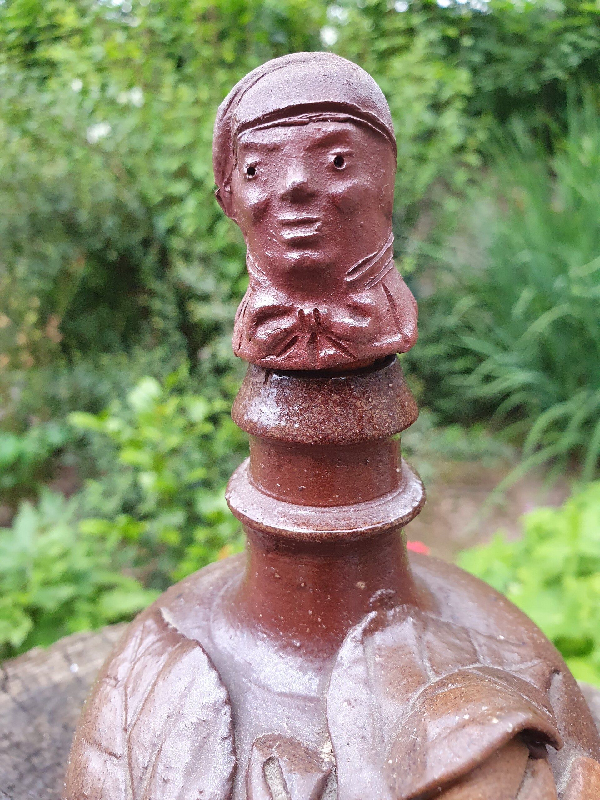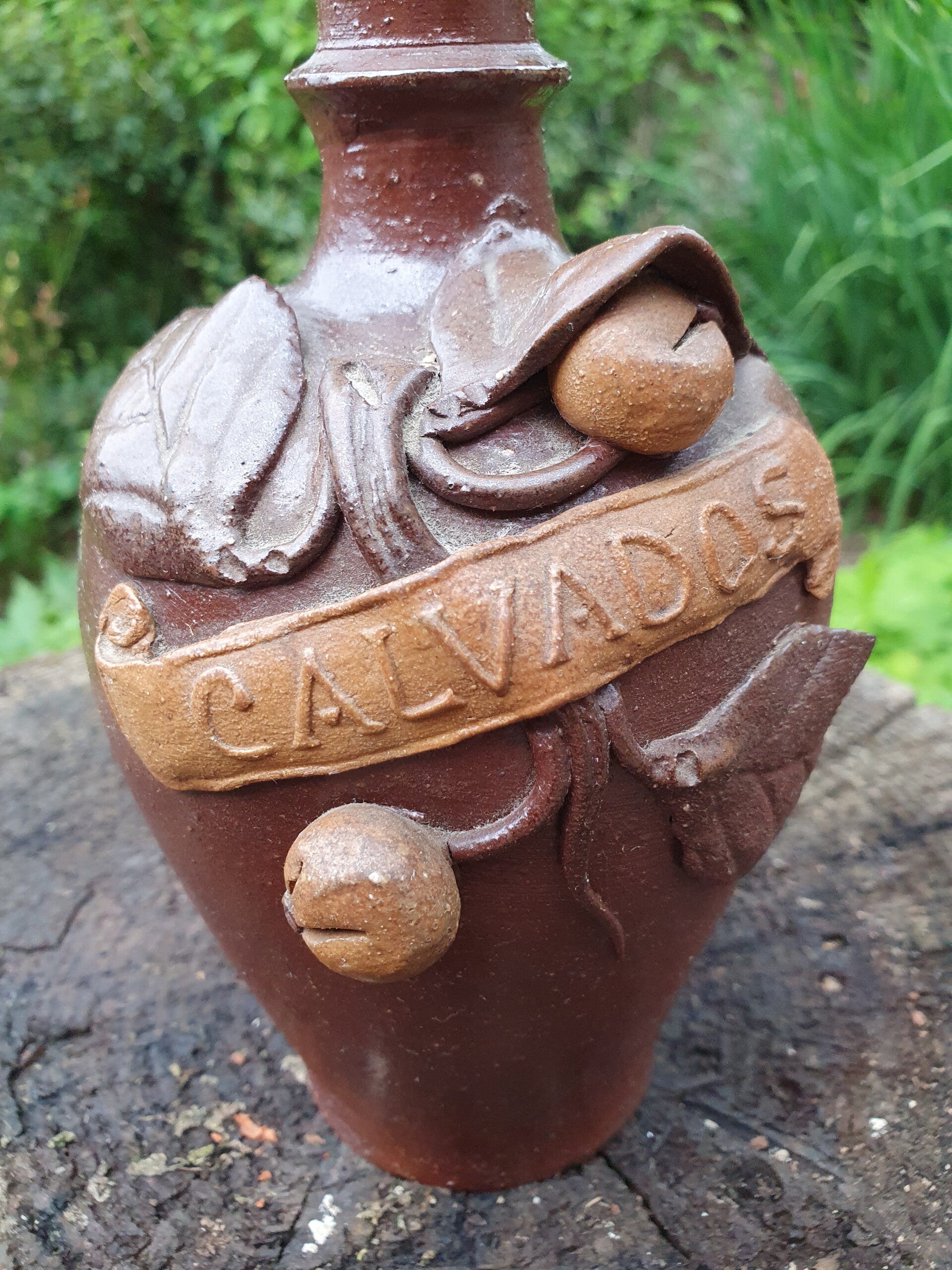 Rijk gedecoreerde Calvados kruik met een stop in de vorm van een mannenkop.